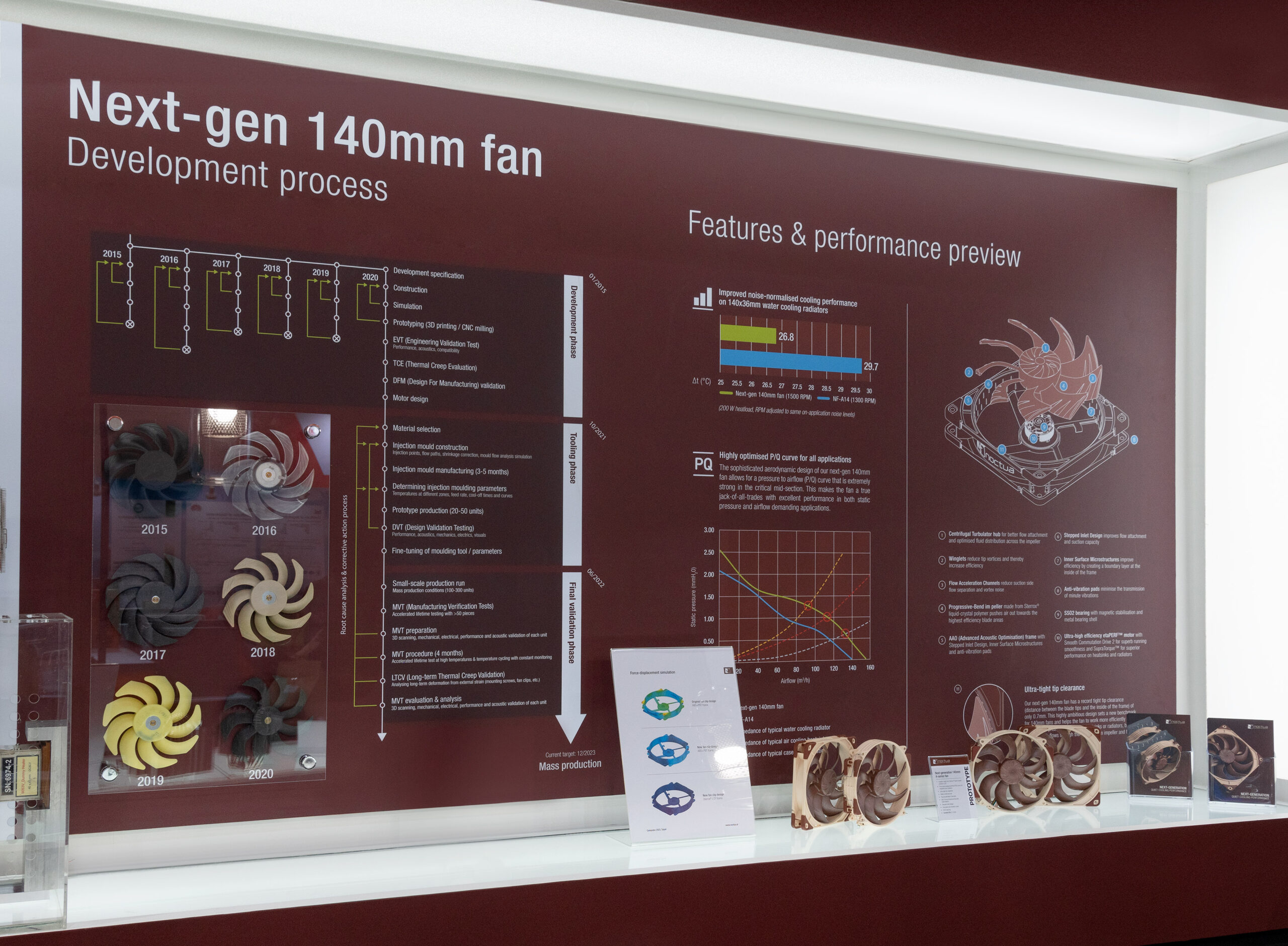 Long-awaited by customers, Noctua’s next-gen 140mm fan has been subject to repeated delays. At Computex, Noctua gave exclusive insights into the challenges of the development process and manufacturing of this fan. While the project was started as early as 2015, it took until 2020 and several iterative feedback cycles with new approaches in construction until the performance benchmark of providing a meaningful improvement over NF-A14 and NF-A12x25 with NA-FMA1 adaptors was finally reached. By October 2021, the design was finalised for manufacturing and the tooling phase was initiated. After designing, manufacturing and validating the injection moulding tool, the final validation phase started in June 2022. Unfortunately, the Manufacturing Validation Test (MVT) revealed a minute deviation at the fan hub at after several years of usage at elevated temperatures as simulated by this accelerated lifetime test. Since the MVT has to run for 4 months and takes several weeks to prepare and analyse, this prompted Noctua to delay the release of the fan by one year in late 2022 in order to give sufficient time for root cause analysis, corrective action and repetition of the test. After temperature fluctuations in the cooling fluid were identified as the root cause and corrected, the second MVT test passed, yet the Long-term Thermal Creep Validation (LTCV) showed tolerance issues due to mounting pressure from heatsink fan clips and radiator mounting screws. To avoid this issue, Noctua now plans to use Sterrox® LCP not only for the impeller, but also for the frame of the fan to make it more resistant against external stress. If the ongoing validation tests show no further issues, Noctua targets to start mass production in late 2023 and bring the fan to the market in Q1 2024.