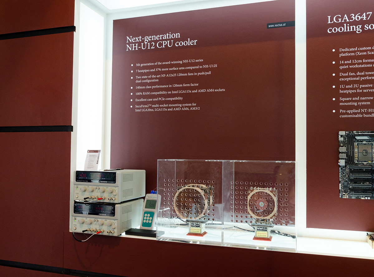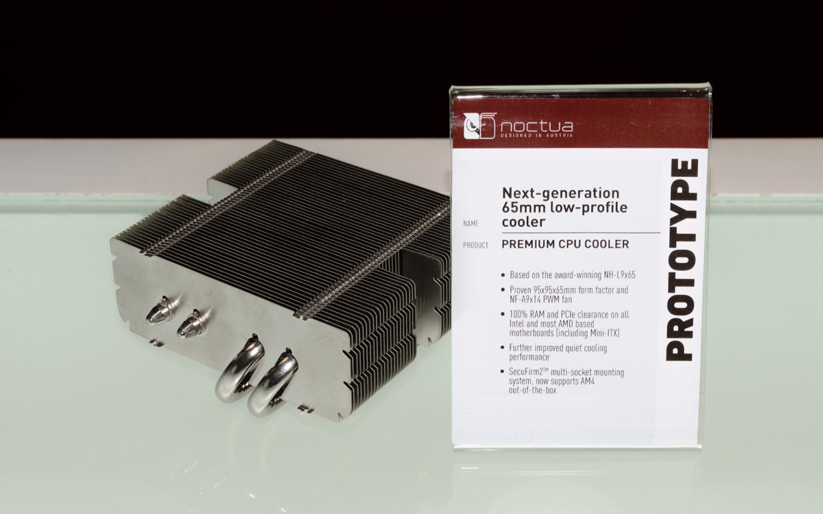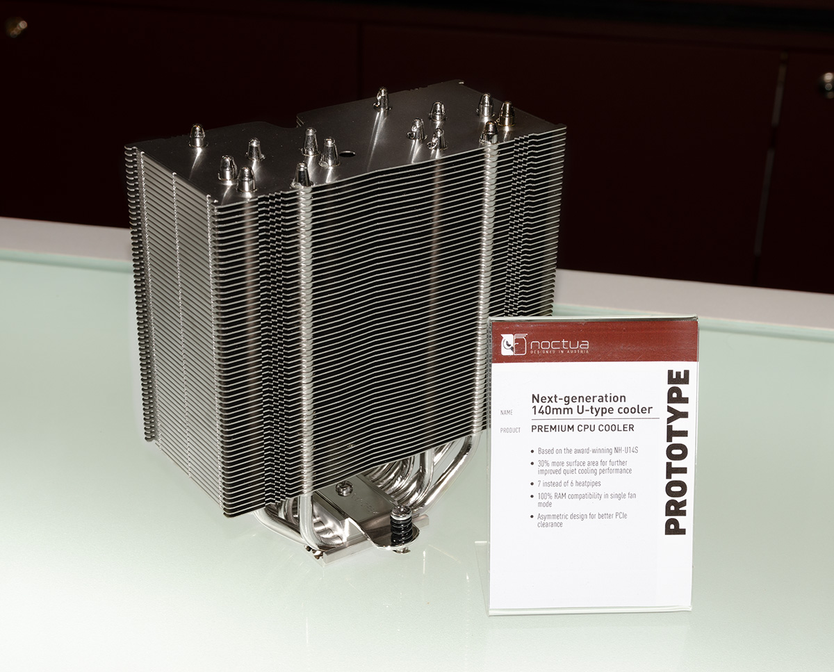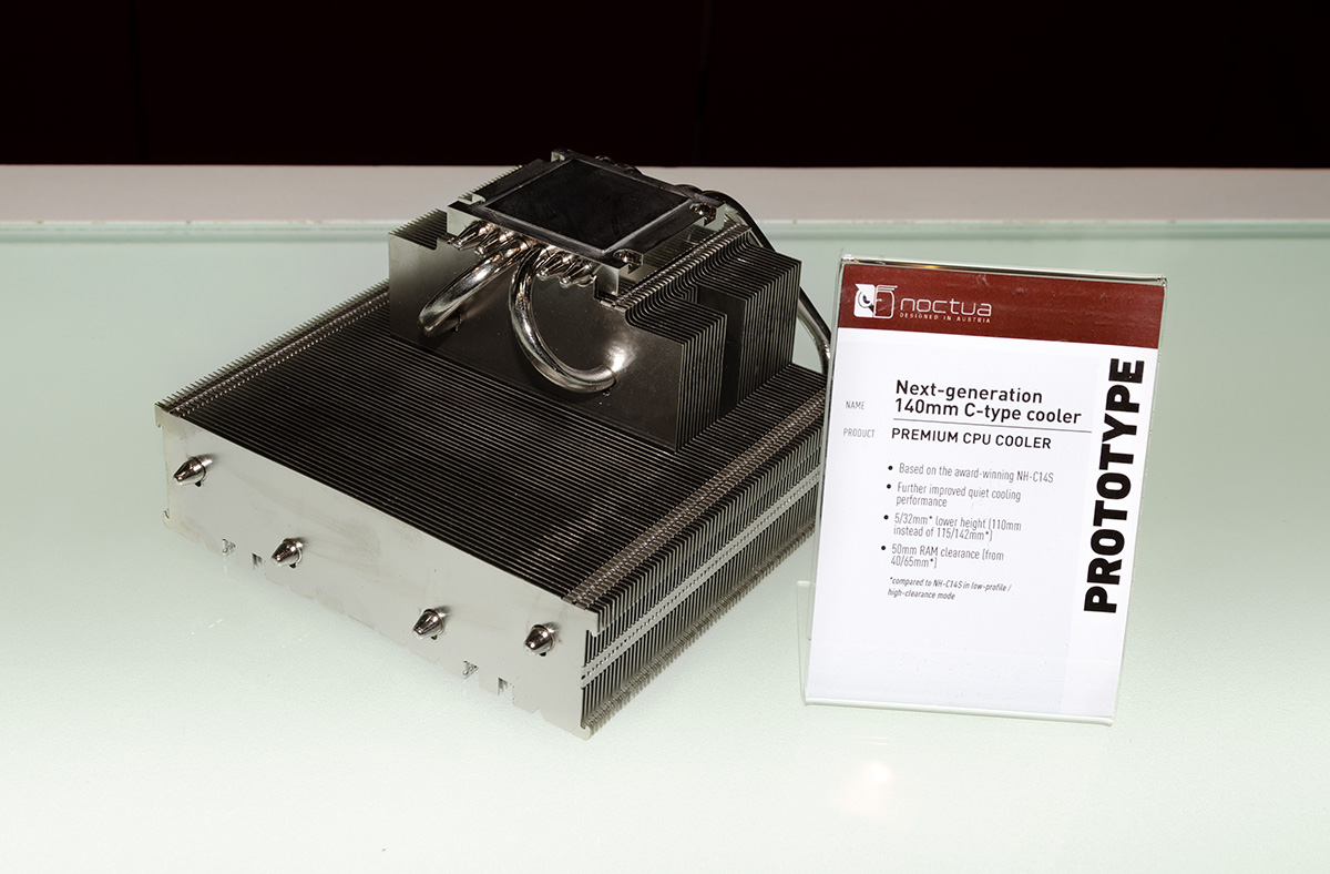In addition to the next-generation NH-U12 cooler, Noctua displayed an incremental performance update to the existing NH-L9x65 (scheduled for Q1 2019) and a future 140mm C-type cooler (no ETA as of yet) as well as one single tower and one dual tower prototype that both aim to further improve the performance of the award-winning NH-D15. Which of the two will be released in 2019 is yet to be determined based on further performance optimisations.