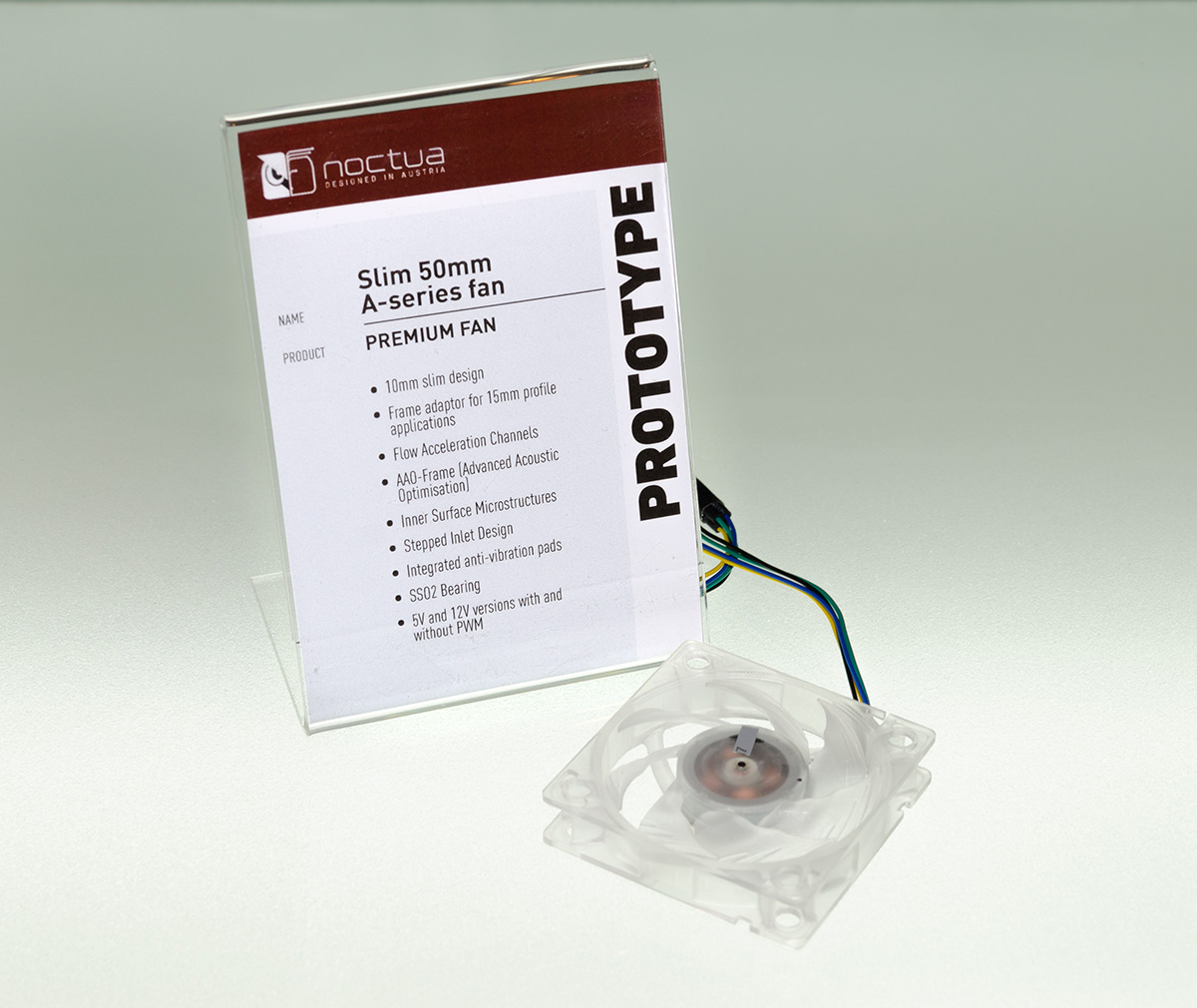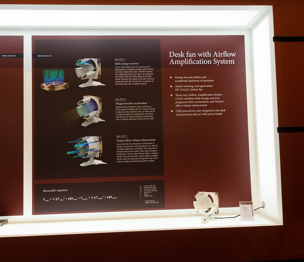 The second application for the NF-A12x25 in Noctua’s show line-up was a desk fan with a three-way Airflow Amplification System that accelerates and enhances the fan’s airflow in order to achieve a strong, focused stream of airflow. Thanks to the Airflow Amplification System, the desk fan’s airflow can be felt even at a distance of more than 2m, despite the fact that the fan is quiet enough to blend into near-silent office environments. The desk fan is currently at the prototype stage and is expected to hit the market sometime next year.