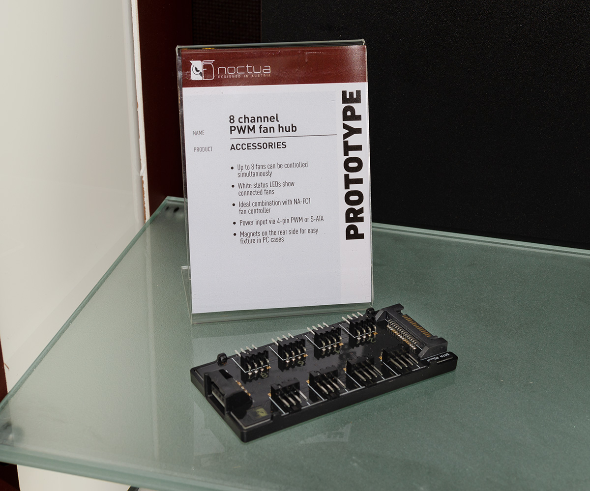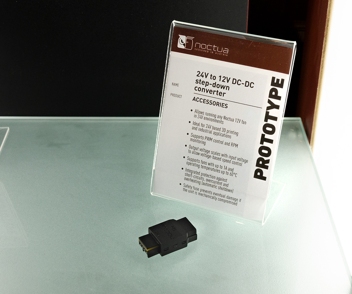 Last but not least, Noctua displayed two upcoming accessories, both of which should be on the market by the end of the year: an 8 port fan hub will allow users to connect, control and monitor up to 8 PWM and a 24 to 12V step-down converter will make it possible to run all 12V Noctua fans in 24V environments, thus enabling users to operate 40 and 60mm fans like the NF-A4x10 FLX and NF-A6x25 PWM in 24V-based systems such as 3D printers. The converter will support both PWM and voltage-based speed control as well as RPM monitoring.