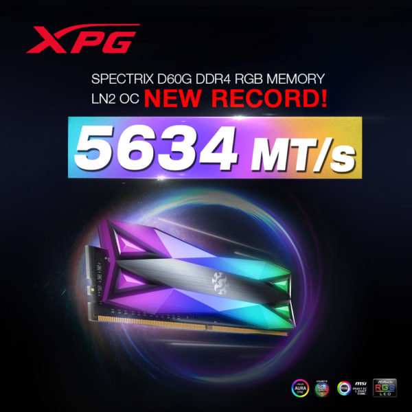 (Taiwan Stock Exchange: 3260.TWO), a leading manufacturer of high-performance DRAM modules, NAND Flash products, and mobile accessories today announces that the XPG Overclocking Lab (XOCL) has overclocked the SPECTRIX D60G RGB DDR4 memory module to a frequency of 5634MT/s, a new record. The previous record was 5608MT/s. The milestone was achieved with an Intel Core i9 chipset and MSI MPG Z390I GAMING EDGE AC motherboard in an LN2-cooled configuration. The results have been certified and published on HWBOT.