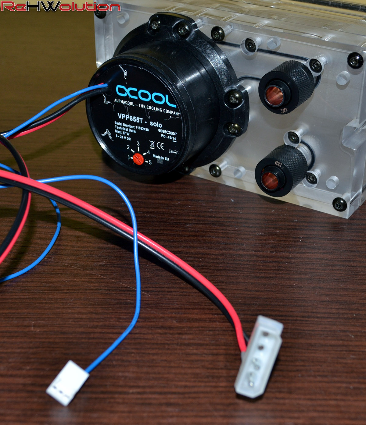La Alphacool VPP655 – Single Edition è una pompa di ultima generazione dell’azienda, che presenta un’alimentazione a 12V tramite connettore Molex. Perché un connettore Molex a 4 pin invece di un connettore SATA Power? Perché la pompa assorbe fino a 37W, decisamente troppi per un connettore SATA Power. Il cavo di alimentazione, infatti, è parecchio spesso, per evitare che si surriscaldi quando la pompa raggiunge picchi di assorbimento. Dietro la pompa è presente un piccolo switch che permette di selezionare la velocità di rotazione di essa, con valori compresi tra 1800 RPM (step 1) e 4800 RPM (step 5). È presente anche un connettore 3 pin (con un solo filo) per ventole, in modo da monitorare la velocità della pompa dal sistema. A 12V, la pompa di spone di una prelevanza di circa 3.7m ed una portata massima di 1500 l/h. con una rumorosità contenuta seppur scaldando il liquido di 3-4°C.
