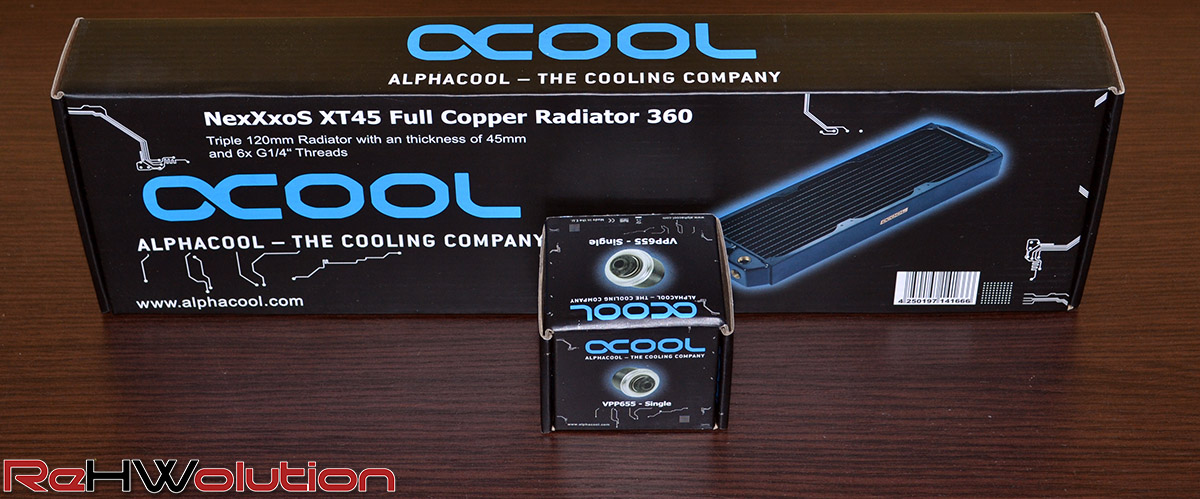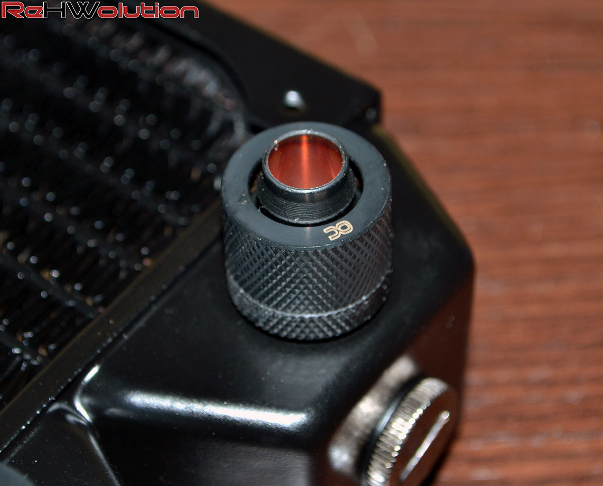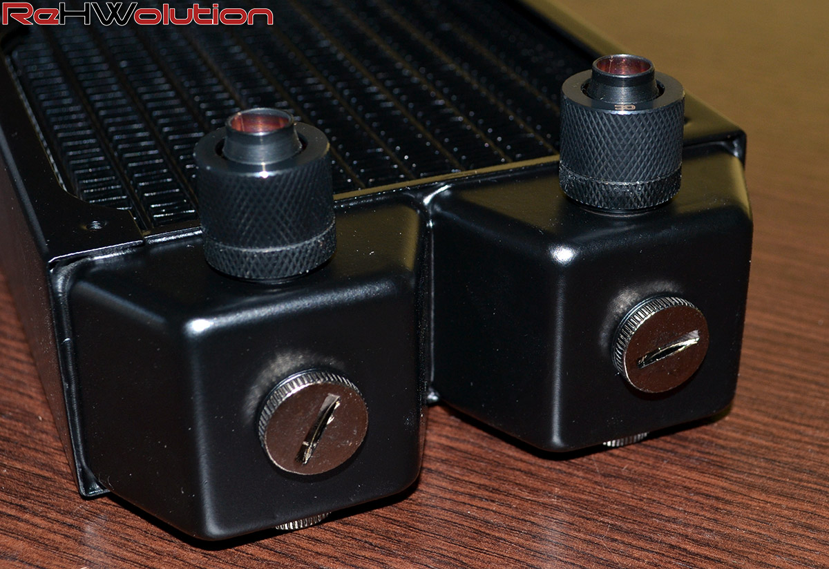 Il radiatore utilizzato in questo sistema è un Alphacool NexXxoS XT45 Full Copper 360, che come suggerisce il nome è fatto interamente in rame, permette l’installazione di 3 ventole da 120 (360) e presenta uno spessore di 45 mm (XT45). Se da un lato è presente una sorta di mini-reservoir per aumentare la quantità di liquido presente nel loop, sull’altra estremità troviamo due protuberanze sulle quali sono presenti un totale di 6 fori filettati da G1/4″. Incluse col radiatore troviamo 24 viti, di cui 12 M3 da 30mm e 12 M3 da 35 mm. Troviamo inoltre dei tappi filettati per bloccare le predisposizioni inutilizzate al momento del montaggio.