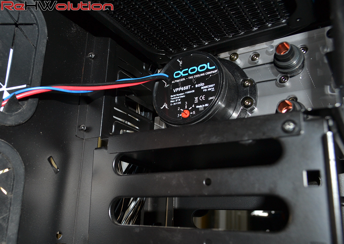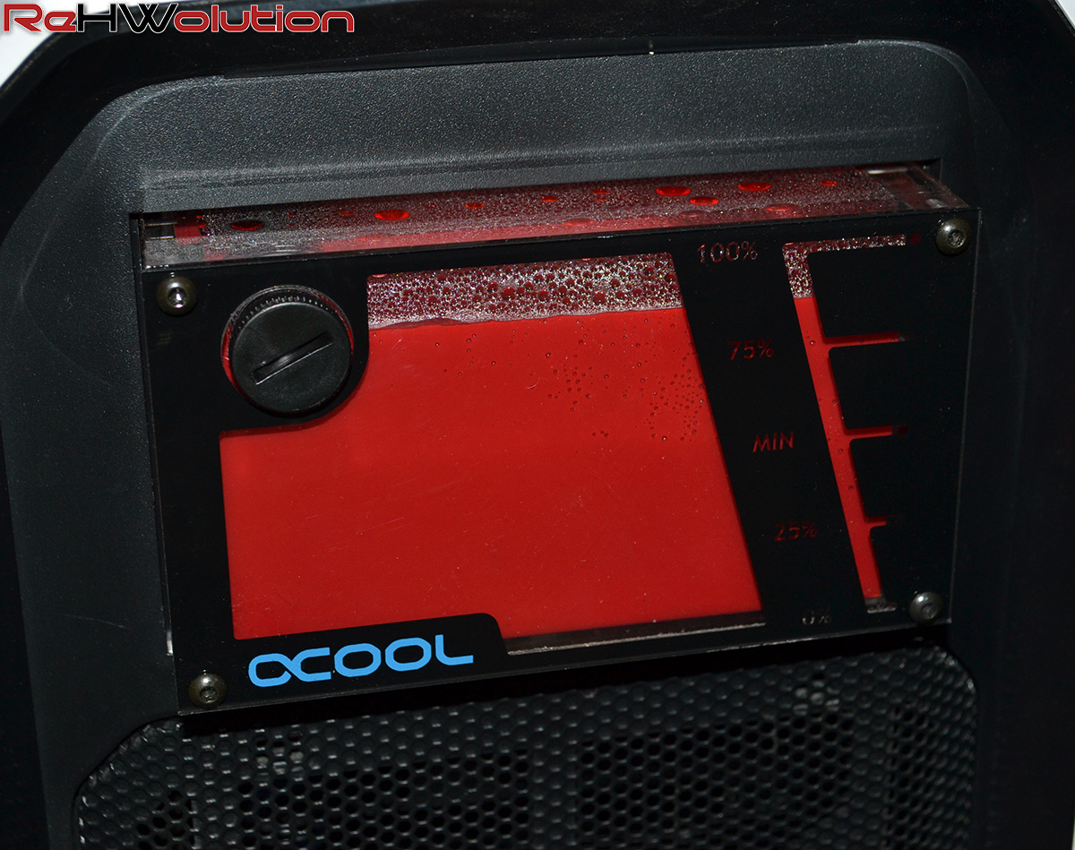 Il reservoir presente nel sistema è l’Alphacool Repack – Single Laing D5 – Dual 5,25 Bay Station, che presenta sul retro una predisposizione per installare, dietro di esso, una Laing D5, pompa inclusa nel kit. Sono presenti due filettature G1/4″ sul retro, e all’interno della vaschetta è presente un sistema di filtri che funge da sistema anti-ciclone, in modo da non permettere l’entrata di aria nel loop. La vaschetta è massiccia, ed oltre a un peso consistente, le pareti di essa sono spesse e incollate tra loro. Durante l’installazione, abbiamo avuto un problema: la vaschetta è più grande dello standard da 5.25″ di circa mezzo millimetro, per cui abbiamo dovuto incastrarla all’interno dei dual-bay da 5.25″ del Graphite 780T di Corsair. Sulla parte anteriore è presente una cosiddetta “straw” che permette il riempimento del sistema senza inserire, nel loop, una filling port (porta di riempimento).