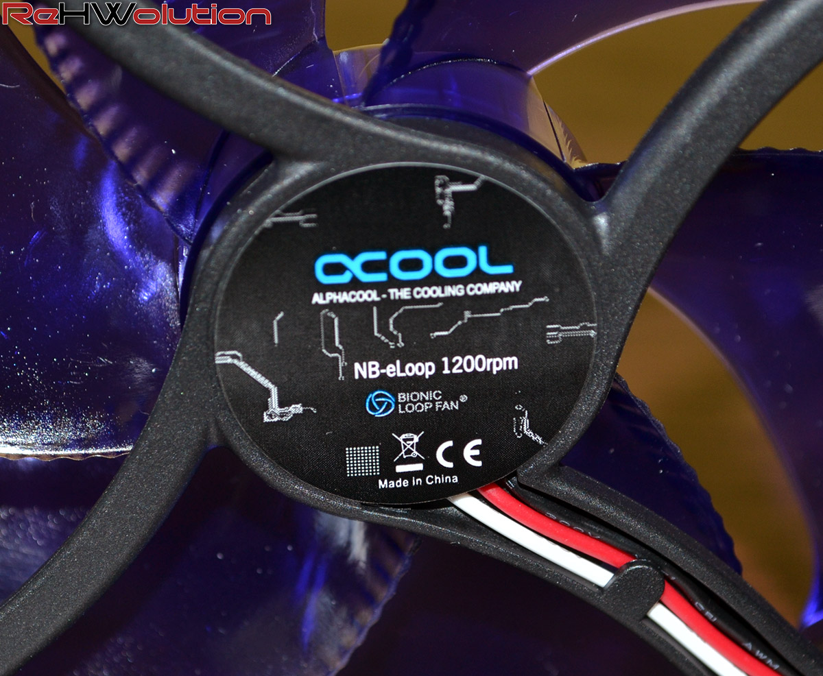 Sono presenti, nel kit, 3 ventole Alphacool sviluppate in collaborazione con NoiseBlocker, noto produttore tedesco di soluzioni di raffreddamento attivo caratterizzate da tantissimi accorgimenti per la massima silenziosità possibile. Con una velocità massima di 1200 RPM (sono disponibili su AquaTuning anche quelle da 2300 RPM), la pressione statica sviluppata è di circa 0.9 mm H2O, mentre la portata è di circa 76 m³/h, equivalenti a circa 45 CFM. Le pale sono in fibra di vetro e presentano una forma aerodinamicamente perfetta, studiata per azzerare le turbolenze e, di conseguenza, abbassare la rumorosità generata.