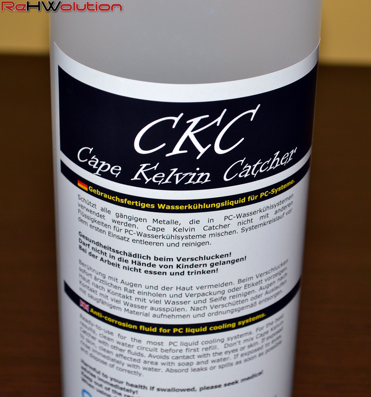 Il liquido presente nel kit è il Cape Kelvin Catcher di Alphacool, nella versione Clear (trasparente). Con proprietà termiche identiche all’acqua, questo fluido per sistemi di raffreddamento a liquido presenta proprietà antibatteriche e biocide, insieme ad elevata protezione contro la corrosione di bronzo, ottone, rame, nickel e via discorrendo. La bottiglia è di 1 L, e a seconda del sistema e della lunghezza dei tubi, potrebbe essere necessario diluirlo con acqua distillata.