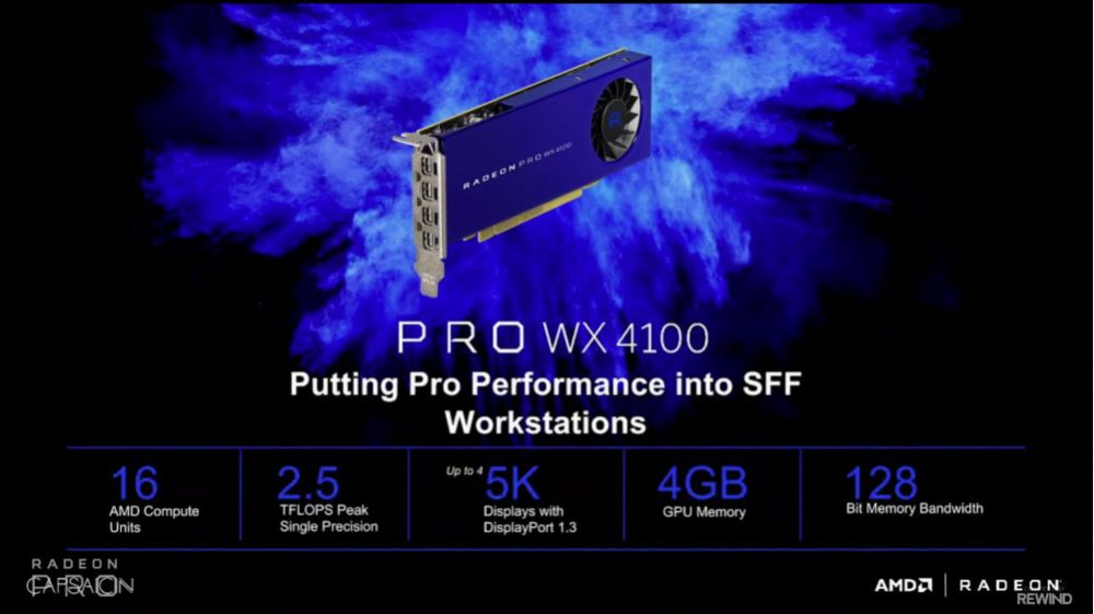 • La Radeon Pro WX 4100 offre dimensioni ridotte, ma ottime prestazioni di calcolo per applicazioni mid-rage, software professionali e tanto altro. Dispone di ben 16 AMD Compute units, 2TFLOPS, 4GB di memoria video e bus da 256bit.