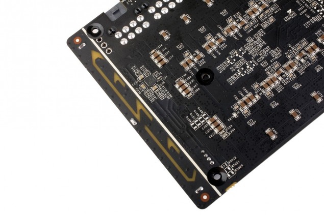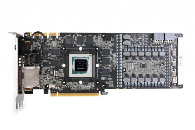 Stiamo parlando della GeForce GTX 980 KUDAN, una delle GPU più potenti al momento basata su architettura Maxwell GM204. La scheda utilizza un PCB completamente ridisegnato, VRM da 14 fasi, doppio connettore PCI-E 8 pin con 375W totali a disposizione, ottimizzazione per il raffreddamento a liquido e dissipatore a triplo-slot a tripla ventola con corpo lamellare in nichel e 6 heatpipe in rame da 6 millimetri.