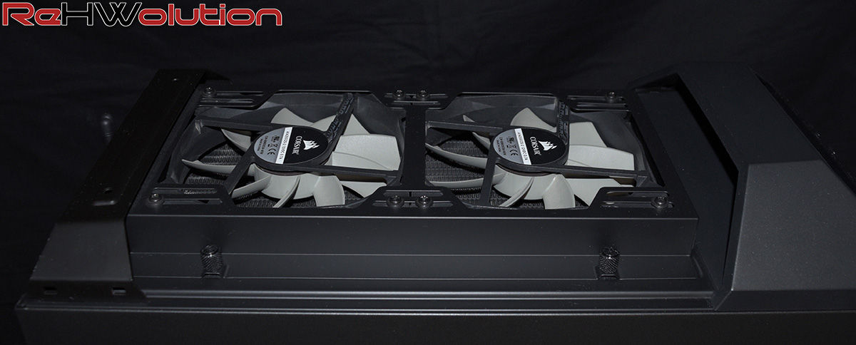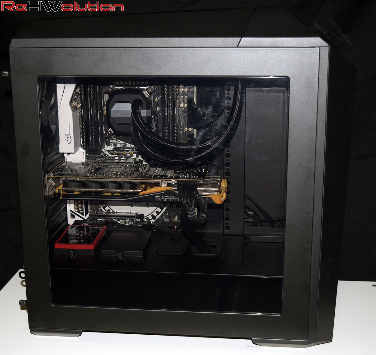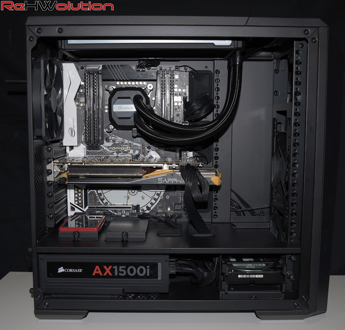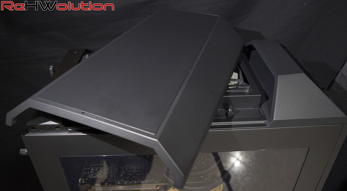 Abbiamo la possibilità di installare schede madri Mini-ITX, Micro ATX e ATX (anche se con la nostra ASUS Rampage V Extreme, installata nella versione “liscia” del case, formato EATX non abbiamo avuto problemi). È possibile installare 4 SSD da 2.5″ e 5 HDD da 3.5″ (o 2.5″), mentre sul fronte delle dimensioni massime, si possono installare dissipatori fino a 190 mm e VGA fino a 412 mm. È possibile installare un sistema di raffreddamento AIO o a liquido con radiatore da 240 o 280 mm, installazione facilitata dalla presenza del bracket nel tetto del case.