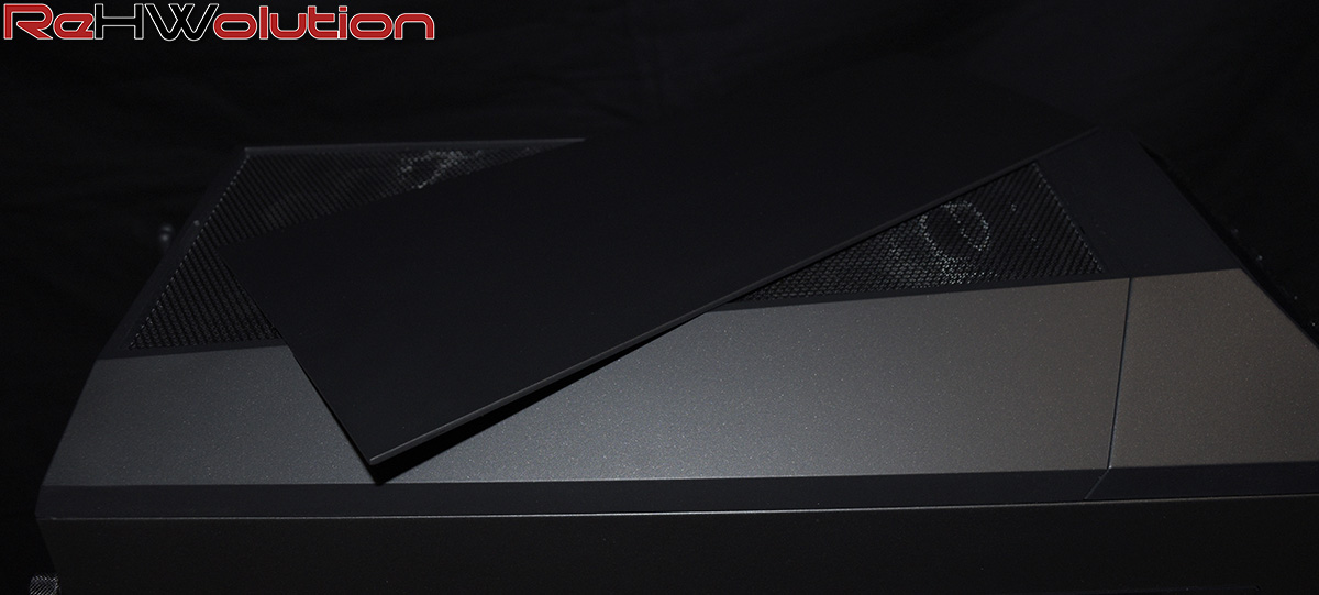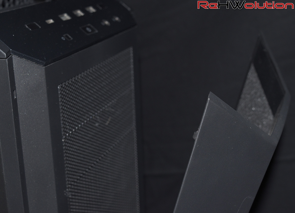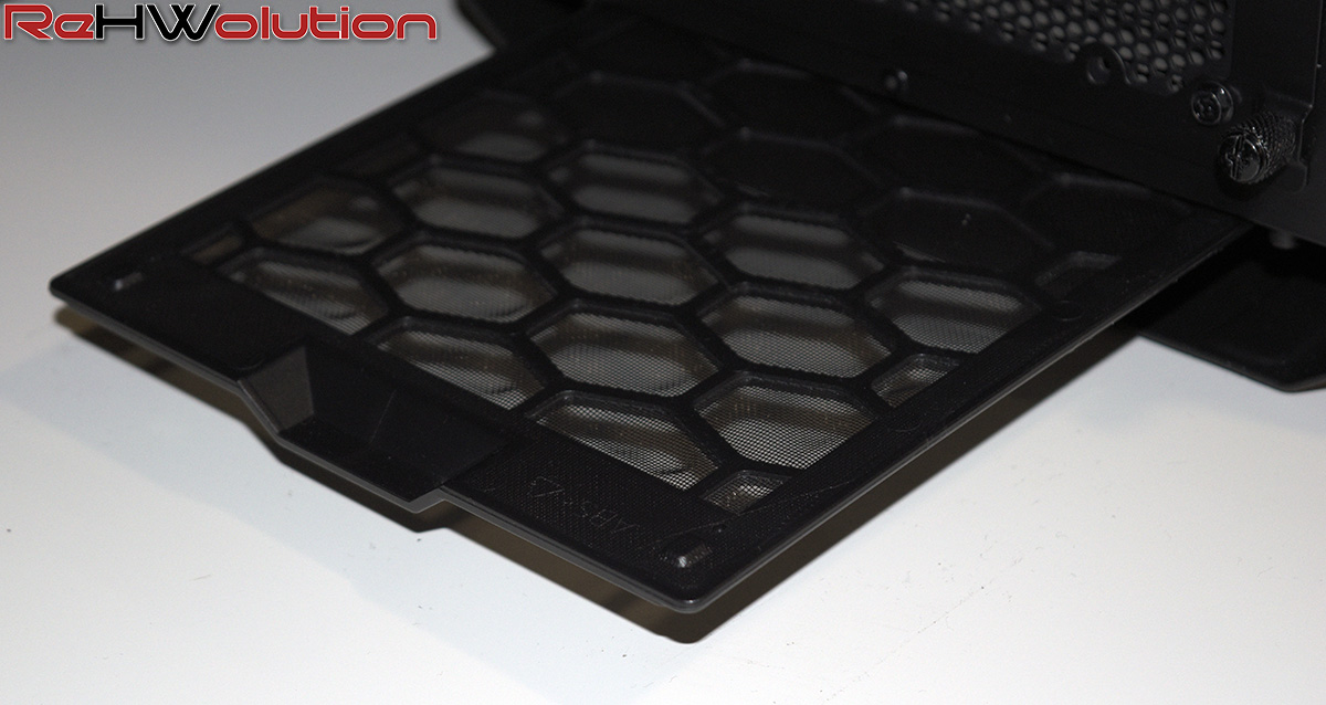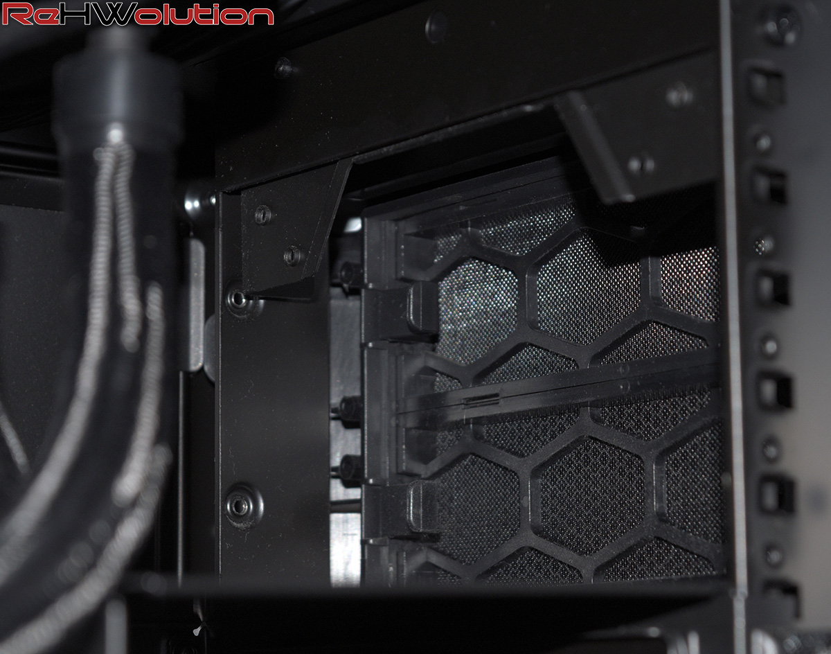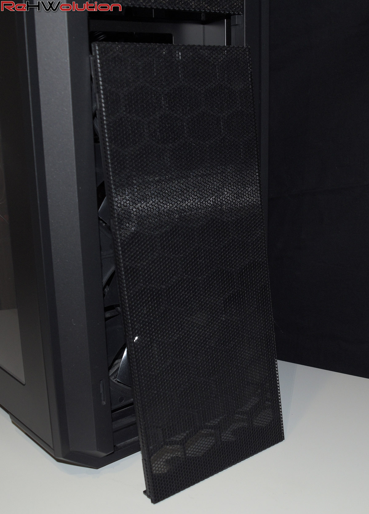La cover frontale, oltre “coprire” i bay da 5.25″ rendendo l’estetica del case più uniforme, è ricoperta da materiale fonoassorbente, che riduce così i rumori prodotti dalle ventole installate nella parte frontale, oltre ad evitare che i rumori “rimbombino” sulla superficie spigolosa di esso.