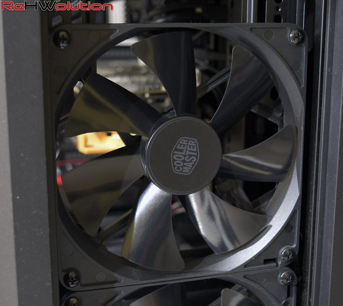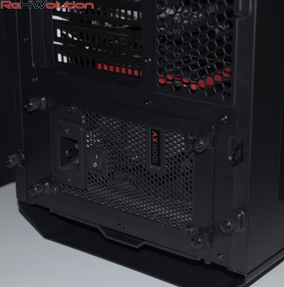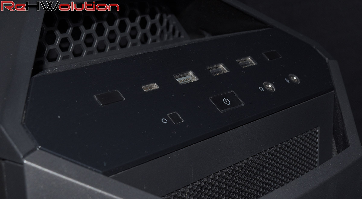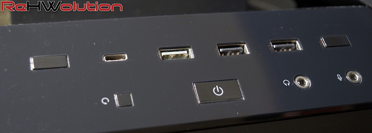 Il pannello I/O frontale è diverso da quello del MasterCase tradizionale, portando con sé 2 porte USB 2.0 e 2 porte USB 3.0, una Type-A ed una Type-C: fate però attenzione perché si tratta solo di un connettore fisico Type-C, e pertanto le velocità massime ottenibili saranno quelle delle tradizionali porte USB 3.0. Presenti inoltre i sempreverdi tasti di accensione e reset, insieme ai jack audio Cuffie/Microfono. Troviamo inoltre un tasto per la gestione dell’illuminazione (impostabile su tre modalità: fisso, breathing, spento) ed un tasto che fa da Rheobus, permettendo di impostare la velocità delle ventole su L (Low) o H (High). Da segnalare che le 3 ventole incluse spostano una notevole quantità d’aria anche in modalità Low, risultando praticamente inudibili. Ovviamente, in modalità High si sposterà più aria, ma tra turbolenze e rumore generato dalle ventole stesse, noterete la differenza.