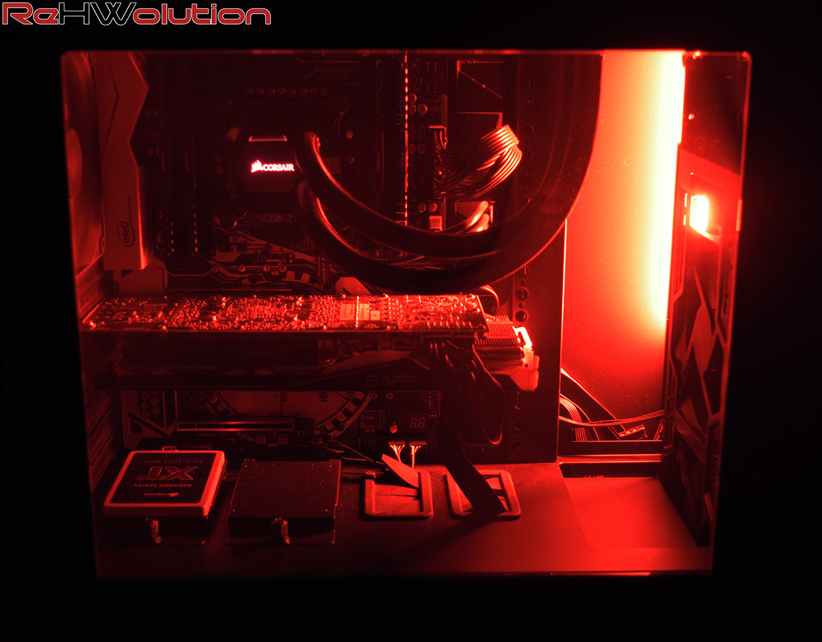 La cover frontale migliora l’insonorizzazione del case, il bracket superiore facilita l’utilizzo di sistemi di dissipazione AIO (o di “nascondere” le ventole, rendendo l’interno del case più pulito), la finestra trasparente (con fascia oscurata per il vano PSU) permette di guardare tutto l’hardware montato nel PC, con la barra a LED rossi che ne vivacizza l’estetica.