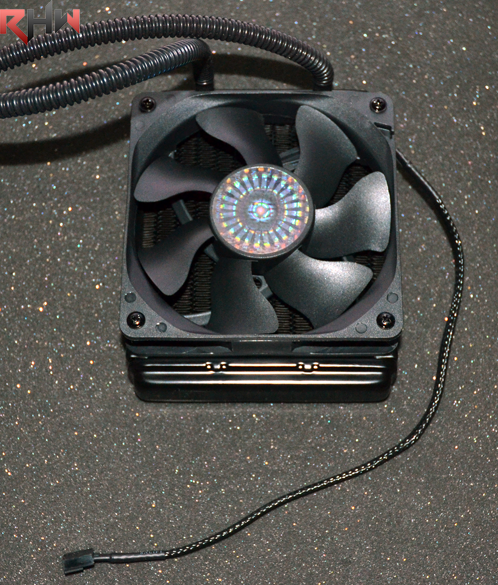 Il radiatore in alluminio da 120 mm presenta uno spessore di 27 millimetri, occupando all’incirca le dimensioni di una ventola da 120 mm di diametro, ventola che è corredata con il dissipatore, e dotata di connessione PWM per la termoregolazione automatica tramite modulazione dell’ampiezza di impulso. Per coloro che conoscono la lineup di Cooler Master, per intenderci è una BladeMaster 120, che dispone di caratteristiche di pressione e portata davvero notevoli, soprattutto se rapportate all’esiguo consumo di corrente, che si attesta su soli 3.6W. Il motore della ventola utilizza un bearing di tipo rifle, che a differenza di quello sleeve non risente di un posizionamento verticale, garantendo quindi longevità maggiore rispetto a quest’ultimo tipo di cuscinetti. Le dimensioni compatte di tutto il sistema consentono di installare moduli RAM voluminosi e di occupare in generale meno spazio rispetto ai sistemi tradizionali ad aria, con un’installazione molto più semplice rispetto ad essi, ed un look più pulito. La pompa ha un assorbimento di 3.6W, e la base in Rame CU1100 ha, dal lato del passaggio del fluido refrigerante, una serie di microcanali che aumentano considerevolmente la dissipazione e lo smaltimento del calore, consentendo in poco spazio di avere prestazioni superiori rispetto a soluzioni che non ne fanno uso.