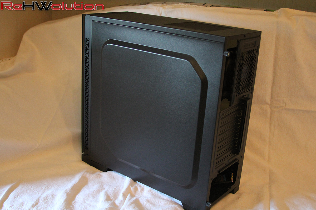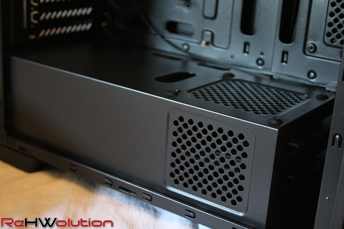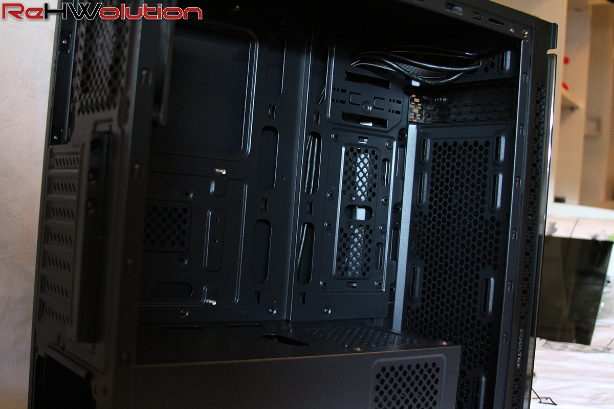 Abbiamo amato l’interno di questo cabinet perché nonostante sia cosi economico, non gli manca davvero nulla. Troviamo un copri-PSU che ci da la possibilità di nascondere il tutto, persino un cestello HDD in grado di ospitare 2 HDD da 3.5″ oppure SSD. Altri SSD possono essere installati in due alloggi situati al lato destro della scheda madre. Non mancano infine dei fori per far passare i cavi in qualsiasi zona o circostanza, anche se purtroppo non ci sono i passacavi in gomma. Fortunatamente non sono essenziali in un cabinet entry-level. Il pannello posteriore è leggermente “bombato”.; abbiamo apprezzato questa qualità perchè ci permette di chiudere senza troppi problemi il pannello e avere un cable-management di tutto rispetto.