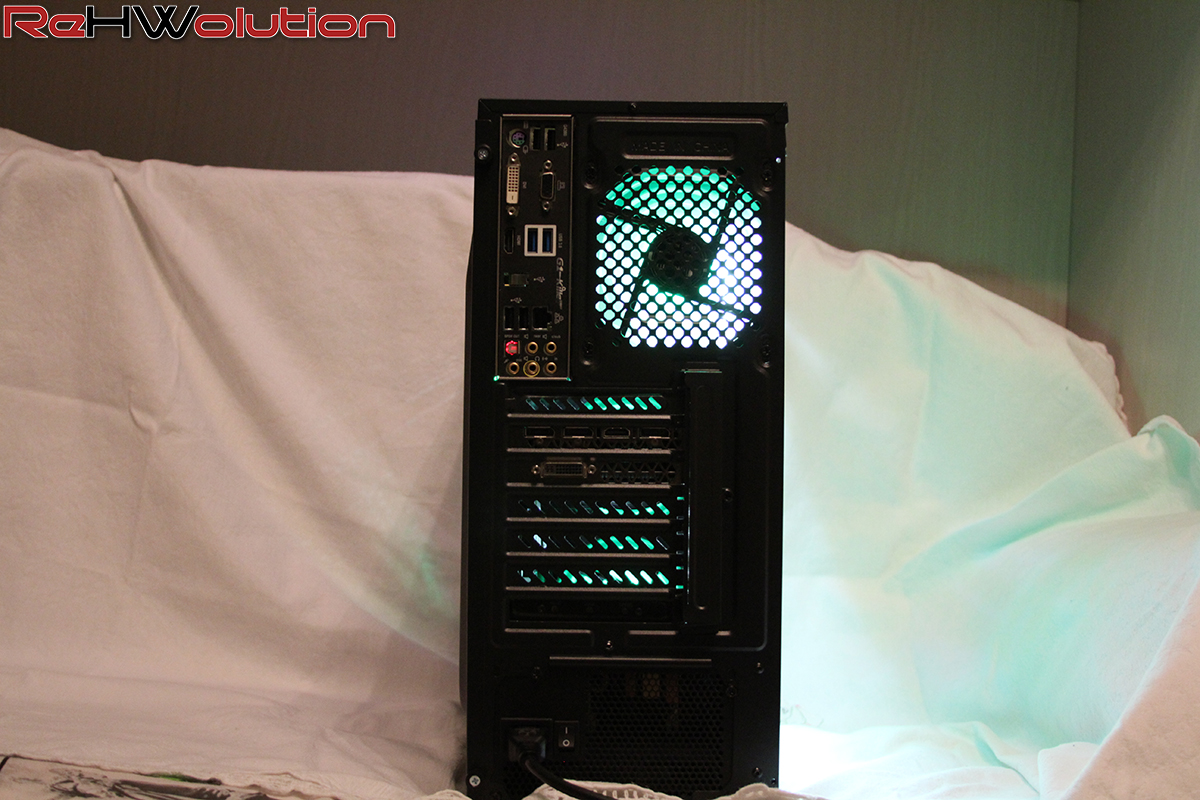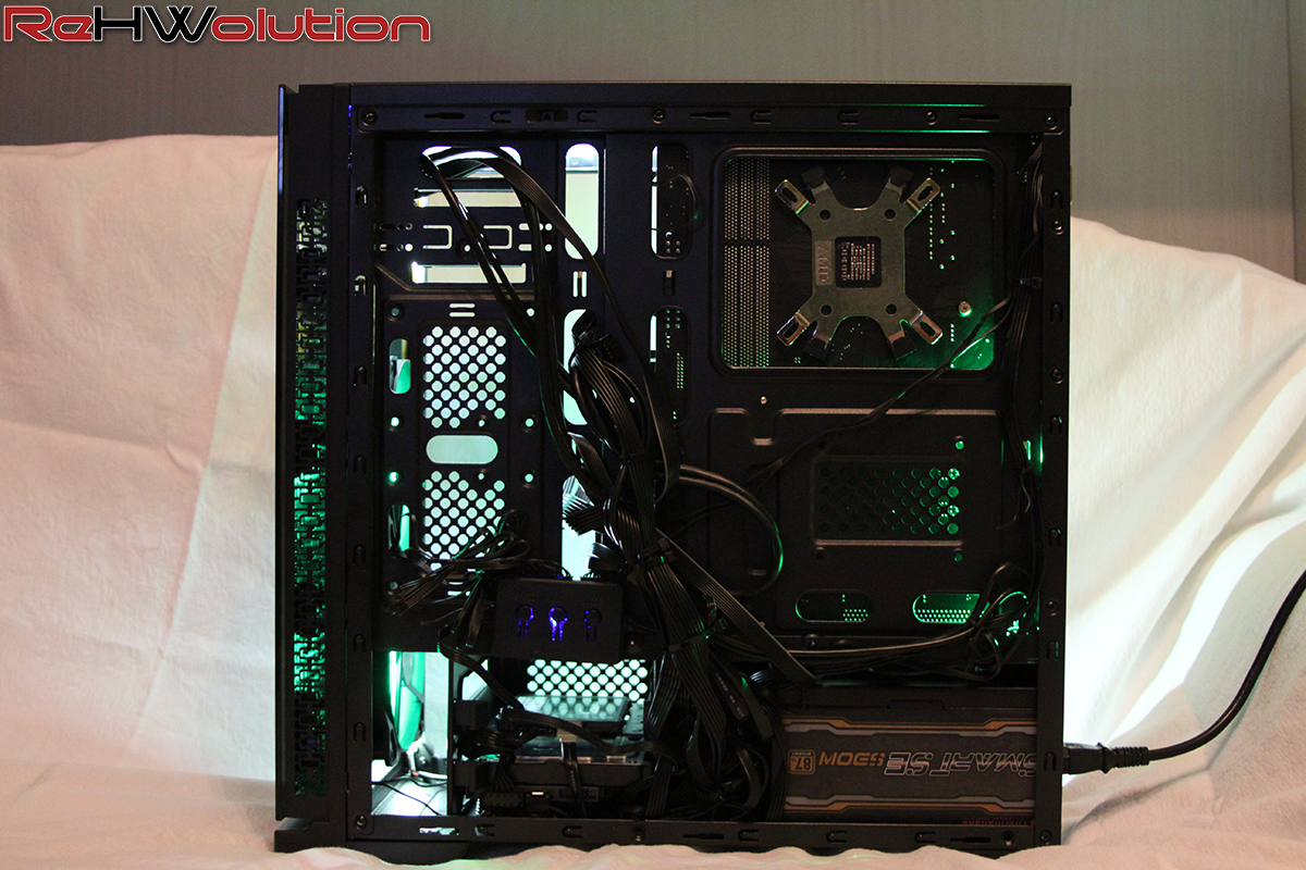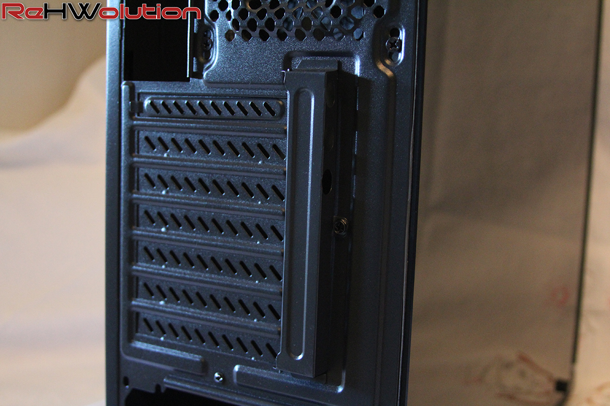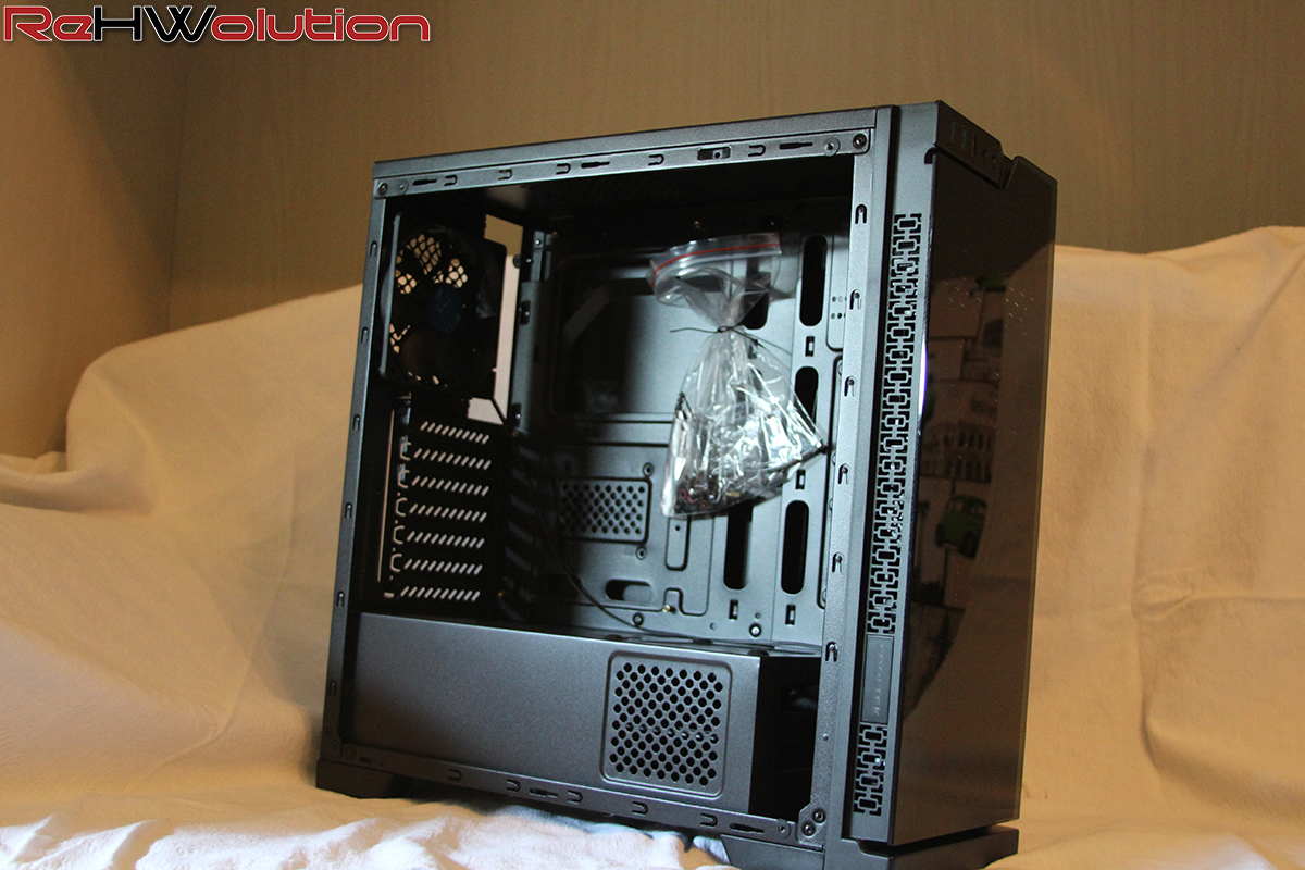 Abbiamo amato l’interno di questo cabinet perché nonostante sia cosi economico, non gli manca davvero nulla. Troviamo un copri-PSU che ci da la possibilità di nascondere il tutto, persino un cestello HDD in grado di ospitare 2 HDD da 3.5″ oppure SSD. Altri SSD possono essere installati in due alloggi situati al lato destro della scheda madre. Non mancano infine dei fori per far passare i cavi in qualsiasi zona o circostanza, anche se purtroppo non ci sono i passacavi in gomma. Fortunatamente non sono essenziali in un cabinet entry-level. Il pannello posteriore è leggermente “bombato”.; abbiamo apprezzato questa qualità perchè ci permette di chiudere senza troppi problemi il pannello e avere un cable-management di tutto rispetto.