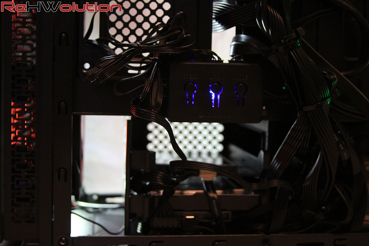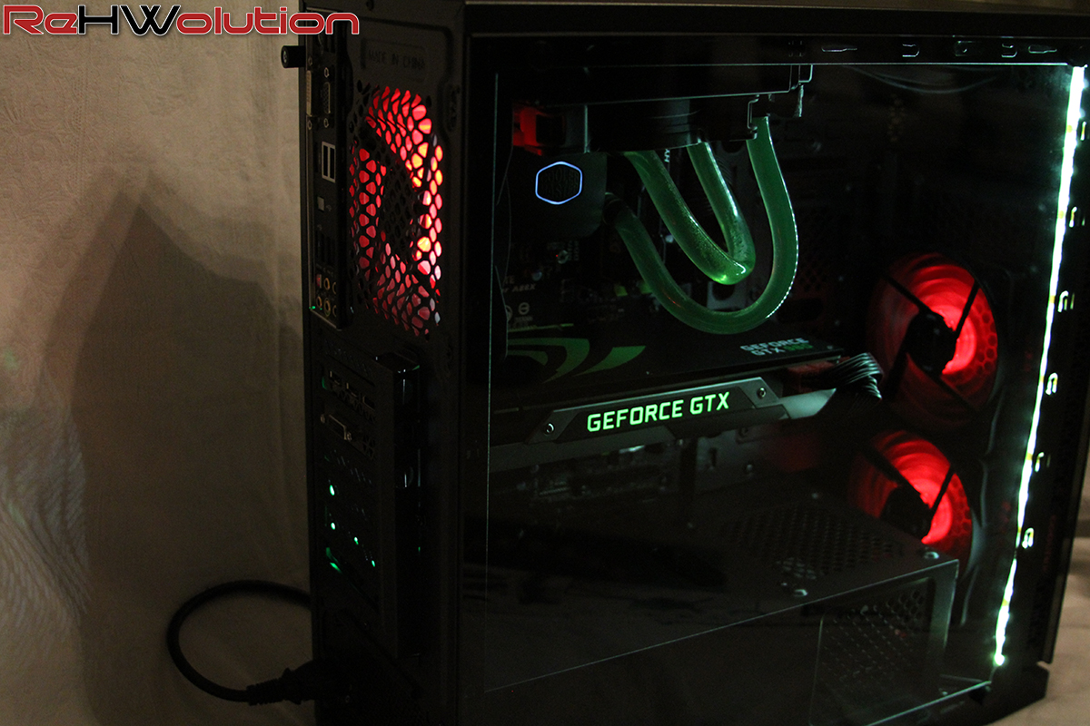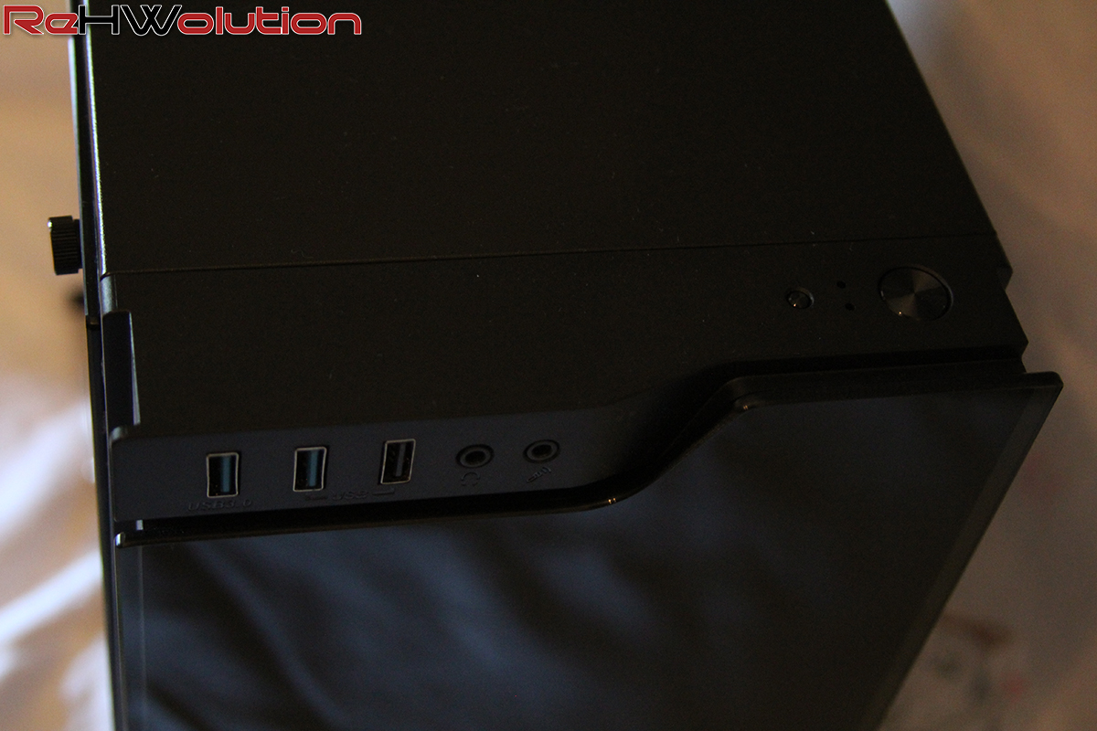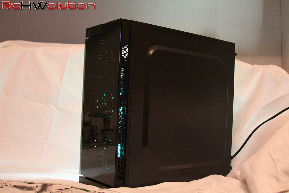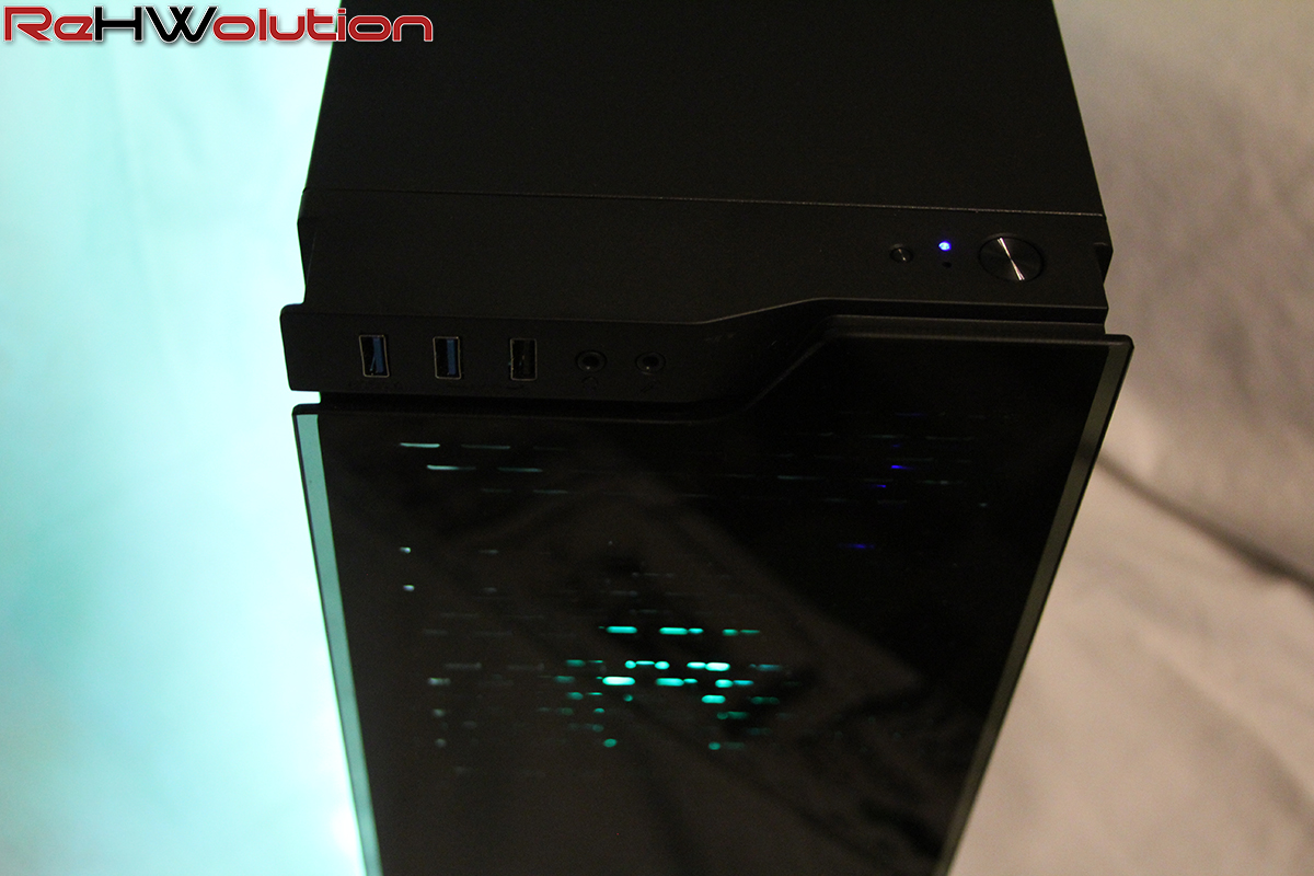Il cabinet offre un look davvero unico e moderno, abbiamo adorato l’utilizzo del vetro temperato oscurato! Nella parte superiore troviamo i pulsanti di accensione, di riavvio, 2 porte USB 3.0 e 1 USB 2.0. Non mancano i connettori Audio e Microfono. Nel modello RGB/Normal troviamo in aggiunta un tastino per modificare i colori delle ventole, feature però non compresa nel nostro modello Basic.