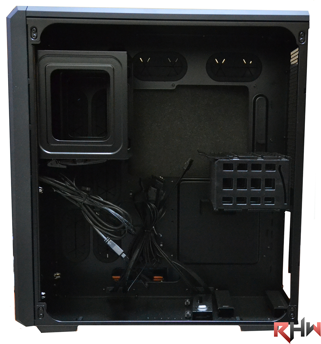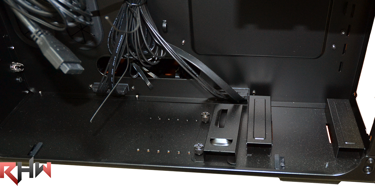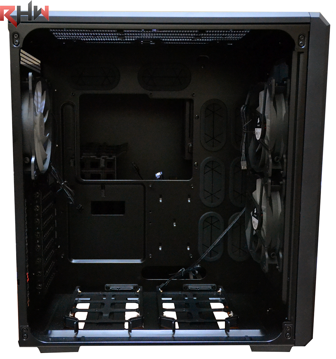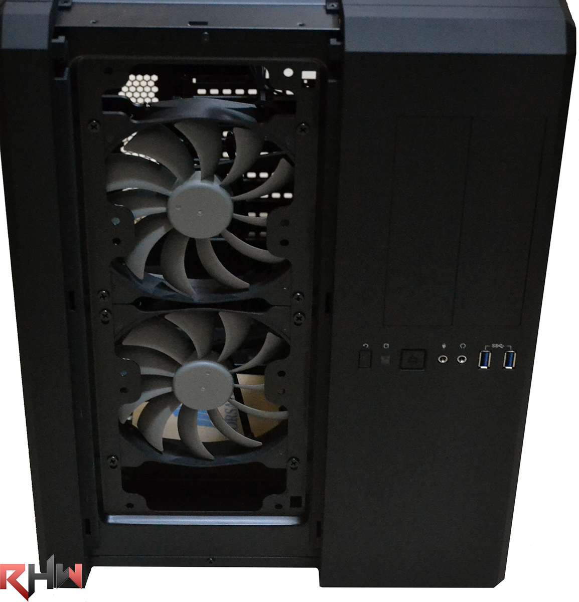 Il case dispone di numerose predisposizioni per raffreddamento a liquido e non, presentando un’elevata distanza tra motherboard tray e paratia sinistra per facilitare l’installazione di dissipatori voluminosi. All’interno della sezione sinistra è presente una gabbia per unità da 2.5″, che consente di installare fino a 4 SSD/HDD della dimensione suddetta, avremmo preferito una soluzione diversa e con una maggiore espandibilità out of the box, ma sono poche le persone che dispongono di più di 4 SSD. Discorso diverso nella parte sinistra, dove le predisposizioni per unità da 3.5″ sono solo due, seppur di tipo hot-swap. Il frontale del case è solido e non ci sentiamo di indicare le due porte USB 3.0 come “poche in numero”: quand’è stata l’ultima volta che avete collegato più di due periferiche sul lato frontale del vostro case? Ecco, proprio quello che intendevo. Una sola cosa mi ha fatto storcere il naso: i due bay da 5.25″ verticali, che costringono all’acquisto di un’unità ottica con carrello dotato di sistema di ritenzione del disco. Soluzione mah ma che comunque ha un suo senso viste le dimensioni non enormi del cabinet.