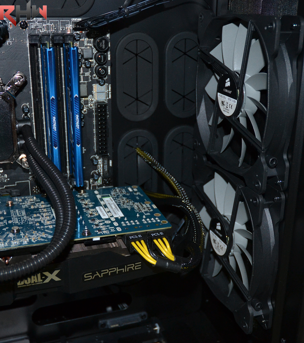 Ciononostante la struttura, con una clip in meno, non ha dato nessun tipo di problemi, a confermare che comunque la qualità generale di Corsair non risente nemmeno della maldestria dei corrieri. Le predisposizioni per ventole sono in totale 6: tutte hanno predisposizione per ventole da 120 mm, mentre “solo” 5 hanno predisposizione per ventole da 140 mm, già presenti in un numero di tre, precisamente due nella parte frontale in estrazione ed una nella parte posteriore in espulsione.
