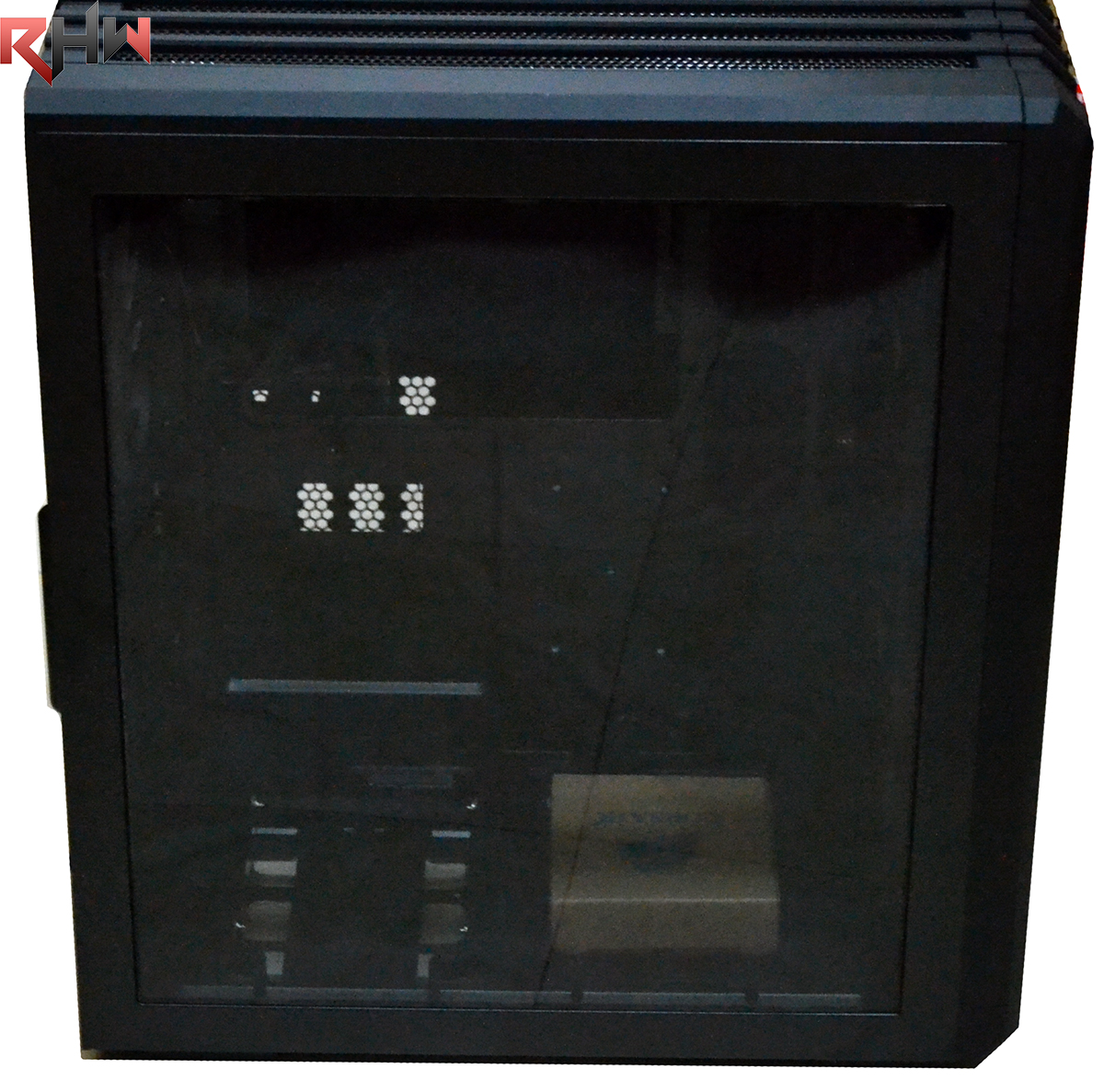 Il case ha un form factor davvero particolare: prende spunto dai più costosi Caselabs e SilverStone dalla forma cubica, riproponendoli ad una fascia di prezzo totalmente differente. Il Carbide 540 AIR presenta due scompartimenti, uno riservato alla parte hardware (sul lato sinistro) ed uno riservato alla parte storage/alimentazione e drives(sul lato destro). Il lato sinistro si avvale di una finestra trasparente grande all’incirca quanto tutta la paratia laterale, tranne che per un piccolo bordo di metallo per permettere l’aggancio alla struttura principale.