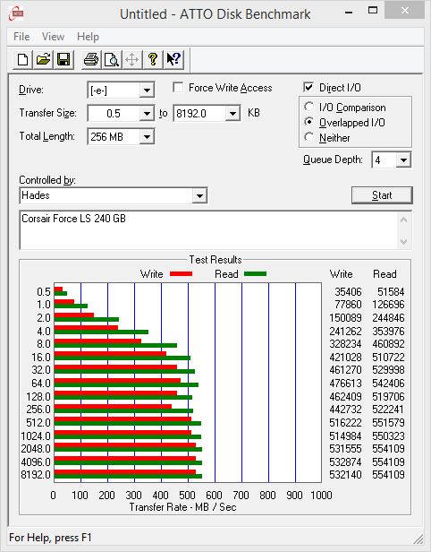 I valori dichiarati dall’azienda sono pressoché ottenuti tramite ATTO Disk Benchmark, con una copertura del 99% dei valori indicati. In particolare, i picchi sono di 554MB/s in lettura e 532MB/s in scrittura. Niente male, per un controller che non sia targato Sandforce né faccia parte di brand più blasonati.