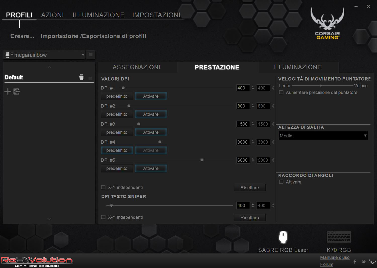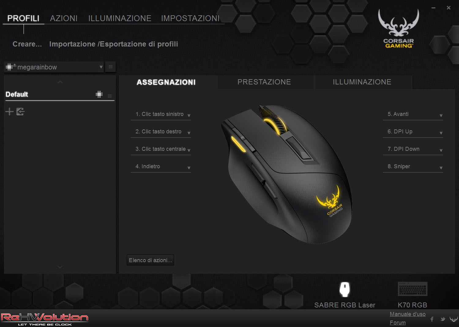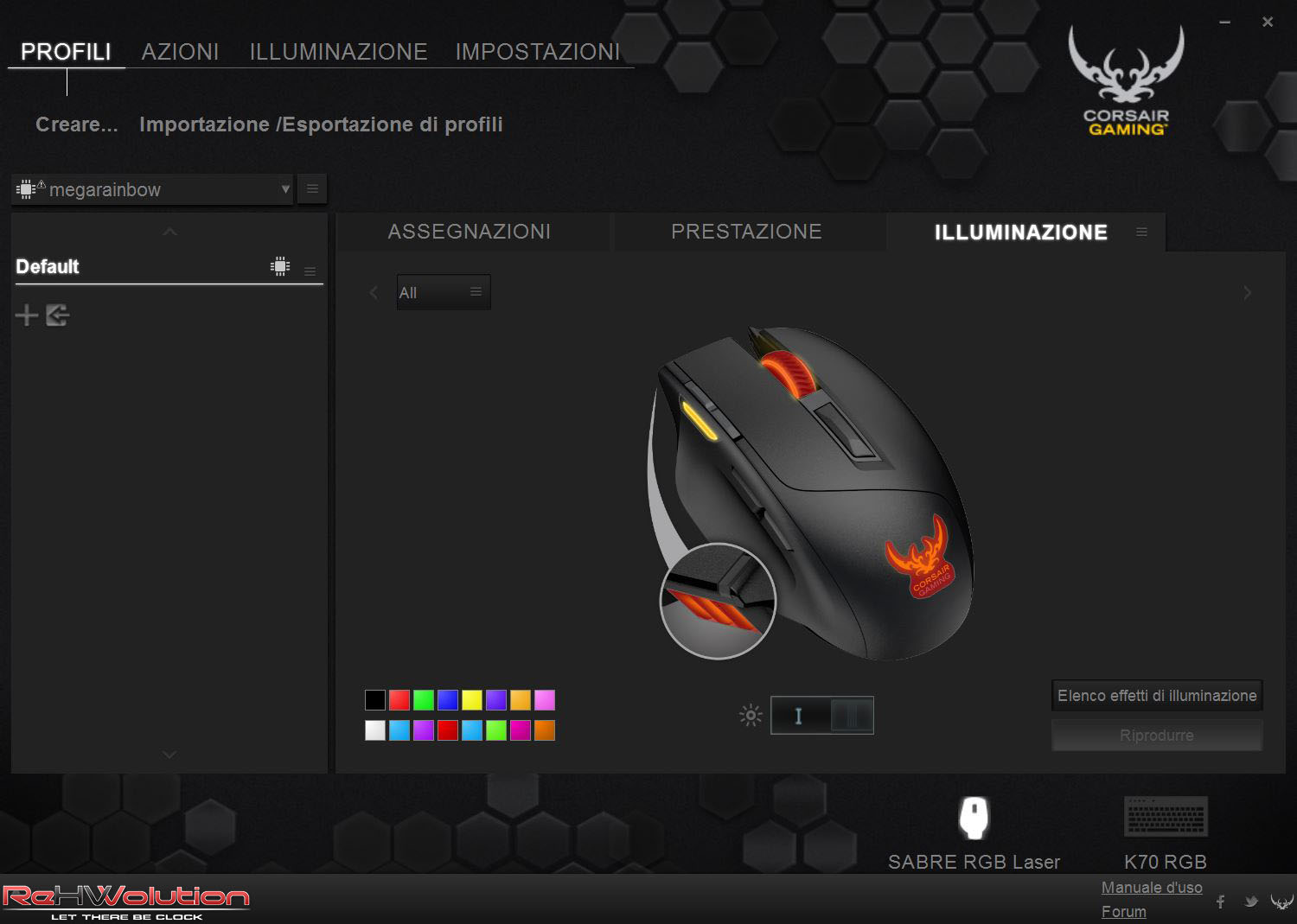 Il software (che gestisce anche la K70RGB da noi utilizzata in abbinamento alla piattaforma di recensioni) è il Corsair Utility Engine, abbreviato in CUE, software che, come visto nella review della suddetta tastiera, sembrava particolarmente complicato da utilizzare. In questo caso, invece, insieme al Sabre RGB Laser (e più in generale coi mouse del brand) esso è semplice ed intuitivo: