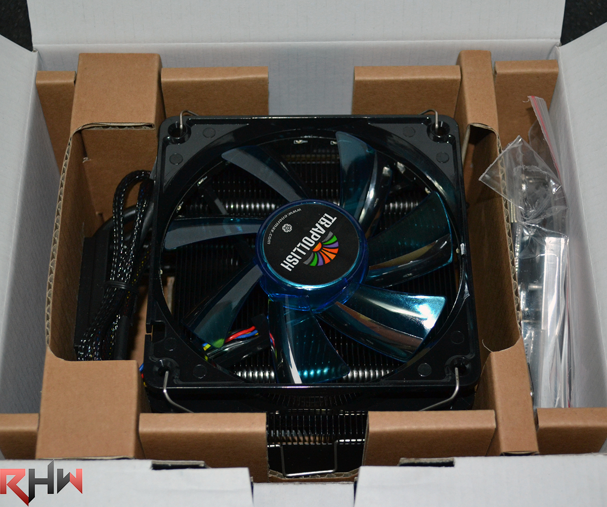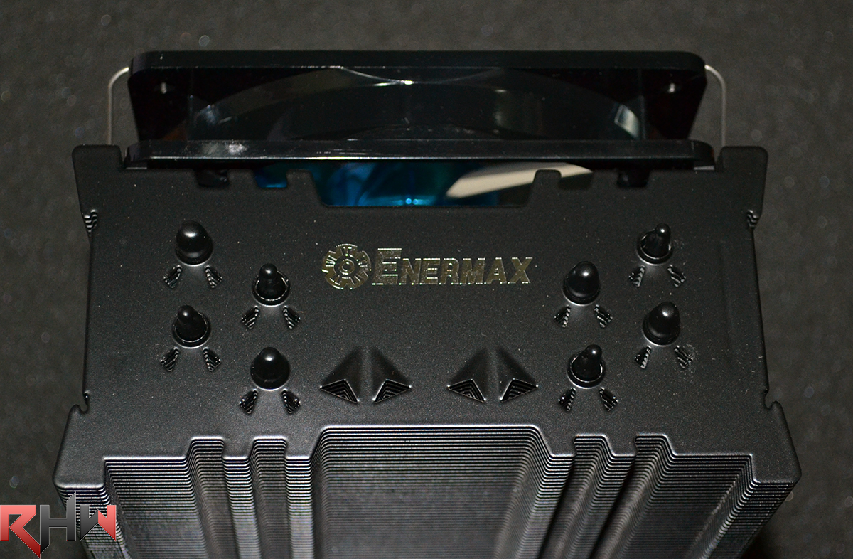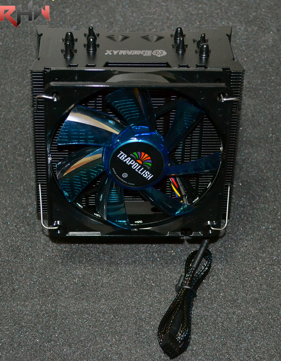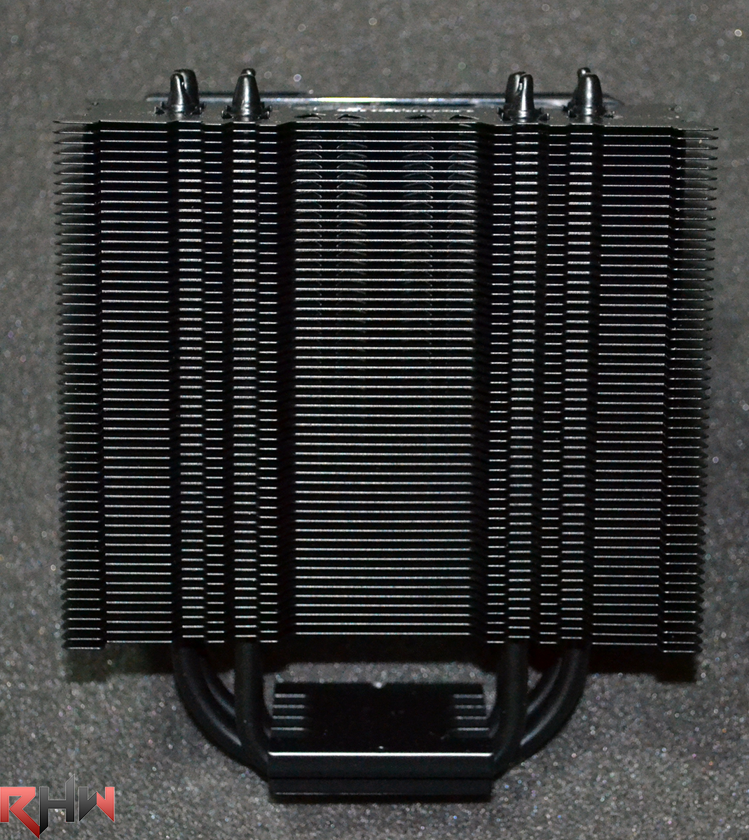 Il corpo dissipante è formato da alette in alluminio di discreto spessore, verniciate in nero semi-opaco e collegate alla base tramite heatpipes, anch’esse verniciate nello stesso colore, ma in rame, nel numero di 4 con un diametro individuale di 6 mm. Le heatpipes confluiscono in un blocco di alluminio, attraversandolo e rimanendo a contatto diretto con l’IHS del processore. Il peso totale, ventola inclusa, è di 610 grammi, ben sotto il limite meccanico di una tradizionale mainboard; oltretutto, il sistema di installazione consente di scaricare uniformemente il peso su tutti e 4 i punti di ancoraggio, grazie al sistema backplate+frontplate e alla barra trasversale che preme il dissipatore sulla CPU. La ventola, a 7 pale blu trasparenti, ha una portata di circa 76 CFM ed una pressione statica di 2.28 mm H2O, valori decisamente adeguati per una ventola da 120 mm e caratterizzata da una rumorosità massima dichiarata di 26 dB(A); essa dispone di collegamento PWM (Pulse Width Modulation) e di ben 12 LED disposti sulla circonferenza interna del frame, che donano al dissipatore un look originale.