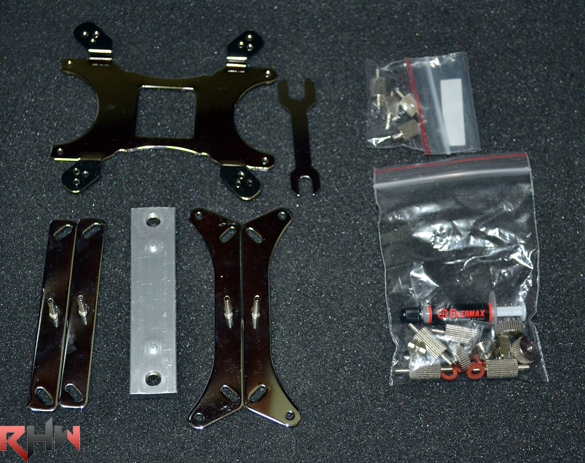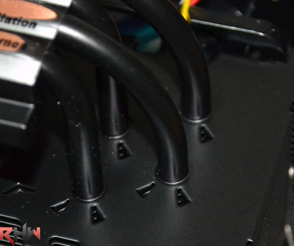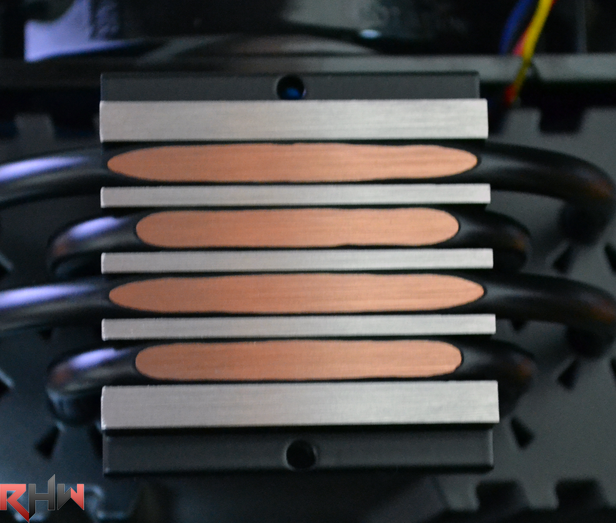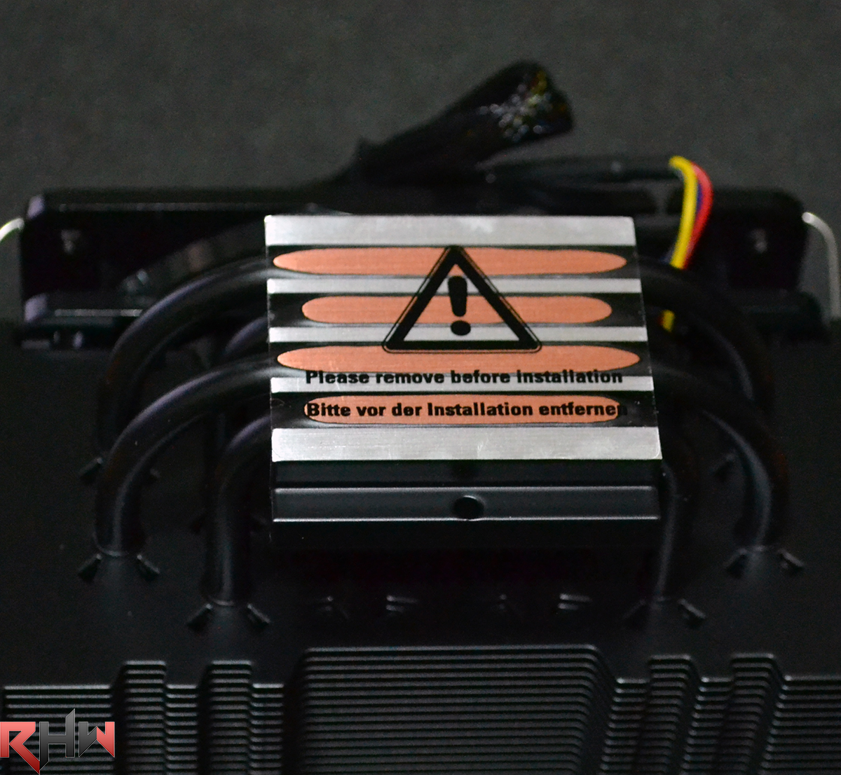 Il corpo dissipante è formato da alette in alluminio di discreto spessore, verniciate in nero semi-opaco e collegate alla base tramite heatpipes, anch’esse verniciate nello stesso colore, ma in rame, nel numero di 4 con un diametro individuale di 6 mm. Le heatpipes confluiscono in un blocco di alluminio, attraversandolo e rimanendo a contatto diretto con l’IHS del processore. Il peso totale, ventola inclusa, è di 610 grammi, ben sotto il limite meccanico di una tradizionale mainboard; oltretutto, il sistema di installazione consente di scaricare uniformemente il peso su tutti e 4 i punti di ancoraggio, grazie al sistema backplate+frontplate e alla barra trasversale che preme il dissipatore sulla CPU. La ventola, a 7 pale blu trasparenti, ha una portata di circa 76 CFM ed una pressione statica di 2.28 mm H2O, valori decisamente adeguati per una ventola da 120 mm e caratterizzata da una rumorosità massima dichiarata di 26 dB(A); essa dispone di collegamento PWM (Pulse Width Modulation) e di ben 12 LED disposti sulla circonferenza interna del frame, che donano al dissipatore un look originale.