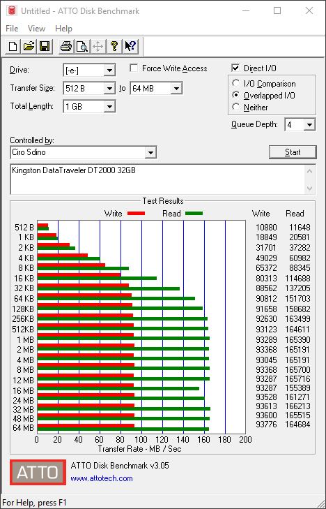 Per verificare che le velocità di lettura e scrittura siano compatibili con quanto dichiarato, ci avvaliamo di due benchmark, ATTO Disk Benchmark (benchmark sintetico che mostra i valori massimi teorici di lettura e scrittura) e CrystalDiskMark (benchmark sintetico che è paragonabile ad un utilizzo ordinario del flashdrive):