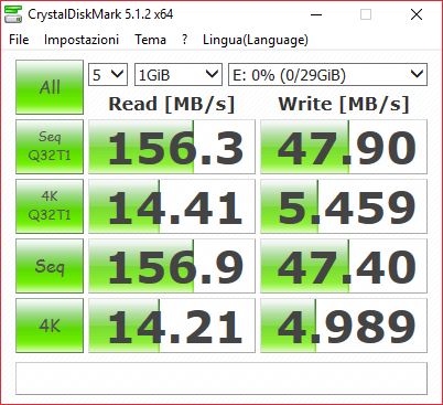 Con CrystalDiskMark, troviamo velocità molto vicine a quelle dichiarate dall’azienda, con 156 MB/s in lettura e 48 MB/s in scrittura. Con ATTO Disk Benchmark, invece, le velocità rilevate sono davvero elevate, con 160 MB/s in lettura e ben 90 MB/s in scrittura. Valori impressionanti, considerando che si tratta del doppio di quanto dichiarato dall’azienda.