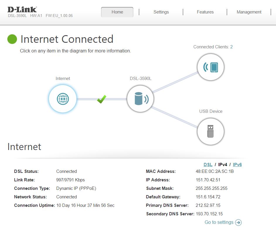 Il modem/router di D-Link è dotato di un avanzato “sistema operativo” (che vedrete un paio di pagine più avanti) che consente una facile e immediata gestione di tutti i parametri di funzionamento, dalla configurazione della linea Internet alle impostazioni di sicurezza delle due reti WiFi (una AC, 5 GHz, ed una N, 5.0 e 2.4 GHz), passando per la possibilità di configurare un NAS con una pendrive inserita in una delle due porte USB, una 2.0 ed una 3.0.