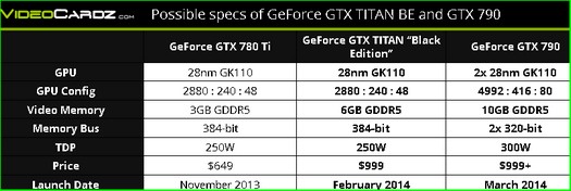 Ancora una volta nVidia al centro della scena, con ben due novità in arrivo appartenenti alla fascia enthusiast del mercato. Secondo il sito videocardz.com, website che secondo le statistiche pare sia abbastanza attendibile riguardo alle VGA, il colosso “verde” starebbe preparando il lancio di due nuove schede grafiche, ovvero la Dual-GPU GeForce GTX 790 e della GeForce GTX Titan Black Edition.