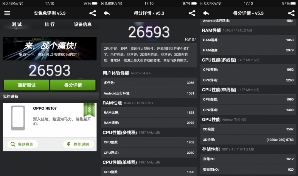 Stando alle caratteristiche emerse, si tratta di un processore Octa Core da 1.5GHz e GPU Adreno 405. Oppo R5 fa registrare un punteggio di ben 26593 punti, poco più di quanto totalizzino le soluzioni attuali Snapdragon 805. Ricordiamo anche che il device utilizza OS Android 4.4.4 Kit Kat che quindi non è in grado di sfruttare le potenzialità offerte dal SoC a 64 bit, 2GB di memoria, display da 5.2″ Full HD 1080p.