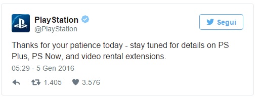 Oggi, a quanto pare, il problema è stato risolto e Sony Computer Entertainment attraverso un comunicato divulgato su Twitter, ha fatto sapere ai suoi utenti che sono previste alcune compensazioni per il disservizio sotto forma di estensioni dell’abbonamento PS Plus, PS Now e del tempo di visione dei film noleggiati.
