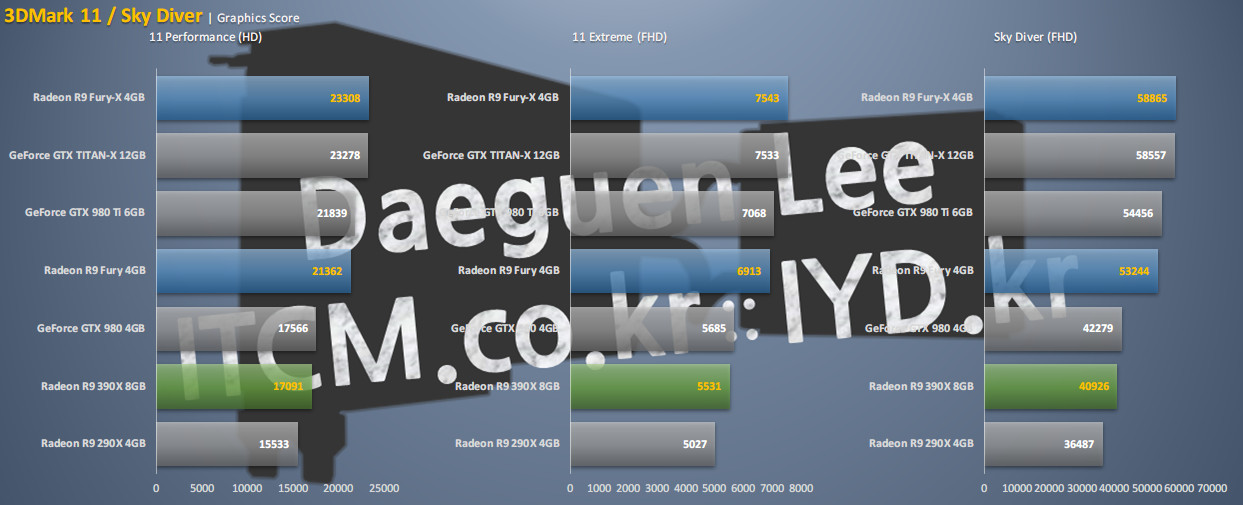 I risultati emersi sono stati pubblicati dai colleghi coreani di ITCM relative alle due rispettive GPU di punta dei due principali colossi di schede video. Nei grafici qui sotto è possibile notare la potenza della nuova Fury X, la quale risulta, anche se di poco, superiore della Titan X tranne nei test con risoluzione 5/8 K, a testimonianza del fatto che la memoria video incide, e non di poco, sulle risoluzioni più alte. Da notare, inoltre, la sorella minore Radeon R9 Fury la quale detiene una potenza simile alla controparte GeForce GTX 980 Ti.