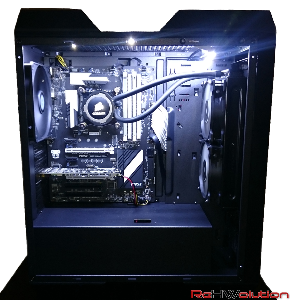 La compatibilità del case si attesta su livelli più che buoni: Mini-ITX, Micro ATX e ATX riguardo al form factory delle motherboard, SSD e HDD oltre a due unità 5.2 e sistema liquid cooling con supporto a radiatori fino a 360mm. In questo caso però bisogna stare attenti: il produttore non indica lo spessore del radiatore, in quanto abbiamo provato un sistema AIO H105 della Corsair con relative ventole e l’installazione si è rilevata poco semplice, causa supporto copri-cavi troppo lungo. Comunque sia, con un po’ di accortezza, è possibile in qualche modo posizionarlo come nel nostro caso, magari adattarlo un po’ più sopra, nei fori guida.