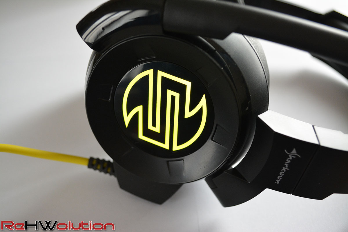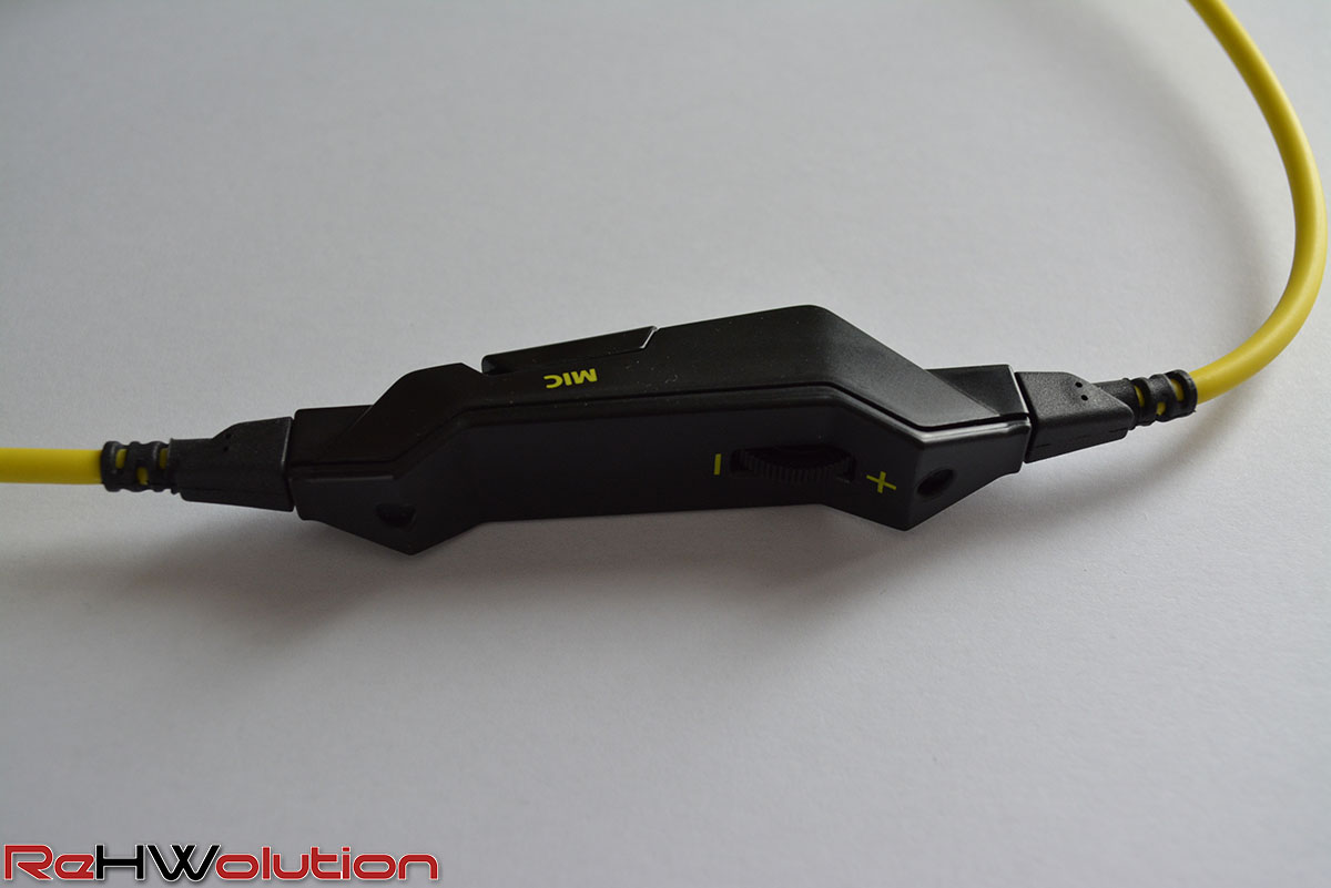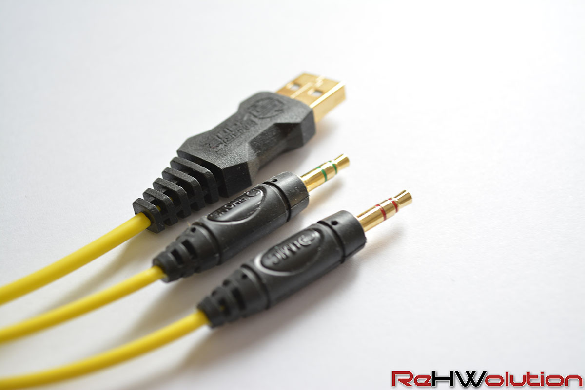Il cavo di collegamento è realizzato in polimeri, senza trama in treccia e di color giallo. Esso è lungo ben 2,50 metri e termina con un connettore USB e due connettori Jack da 3,5 mm, di quest’ultimi; uno è per l’entrata audio e l’altro per l’uscita del microfono. Il terzo connettore, quello USB 2.0, serve unicamente come presa di alimentazione per i due LED gialli posti sui drive e raffiguranti il logo dell’azienda produttrice e per il terzo LED situato all’estremità del microfono. Considerando quest’ultima configurazione adottata dal produttore, la compatibilità è assicurata solamente con dispositivi che presentano un connettori di entrata audio Jack da 3,5mm; quindi PC, Notebooks ma anche Smartphone e Tablet. Infine segnaliamo la presenza di un controller di tipo Tip-Ring-Sleev lungo il cavo e posto a circa 60 cm dall’headset, per il controllo di volume e microfono.