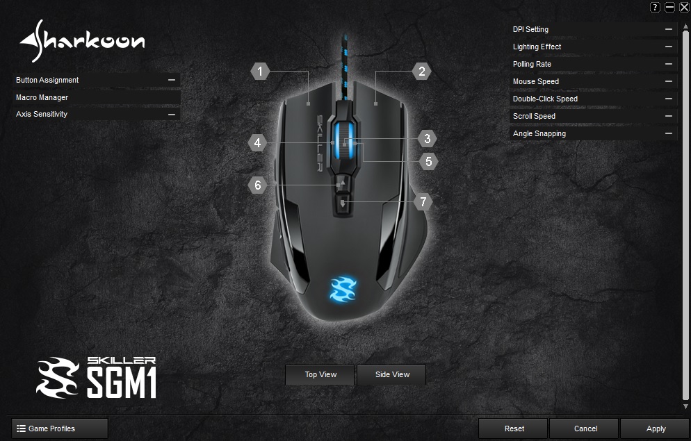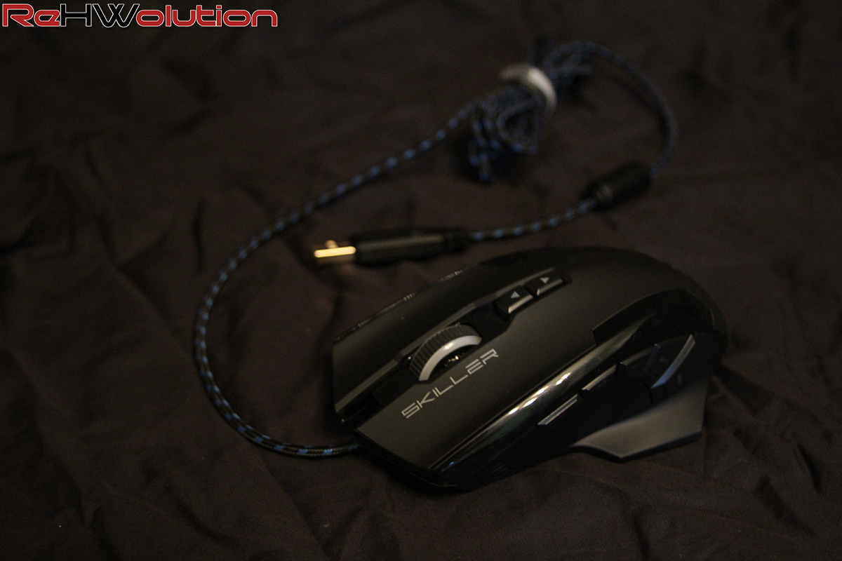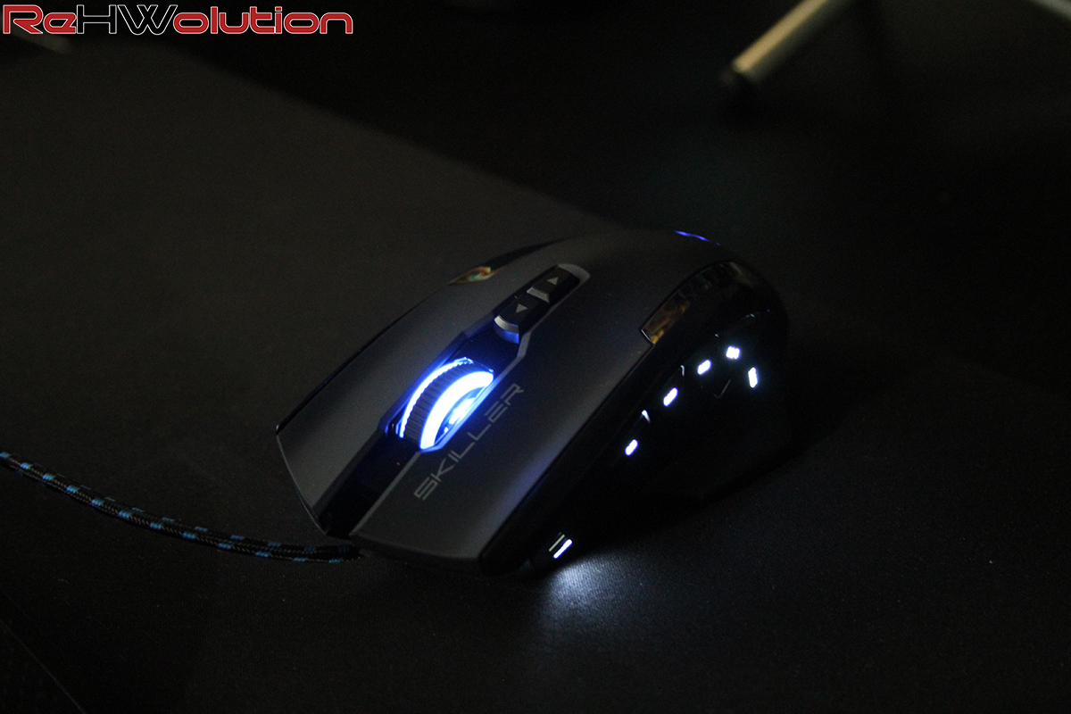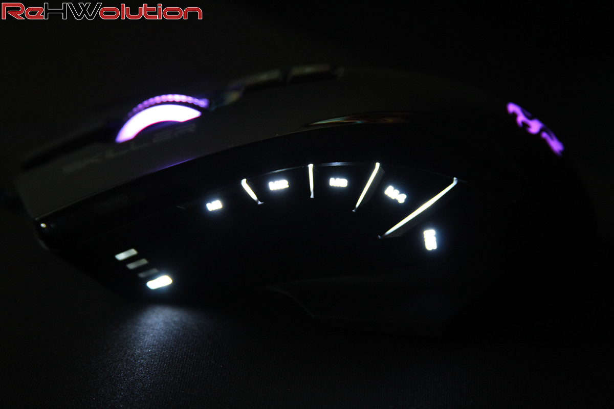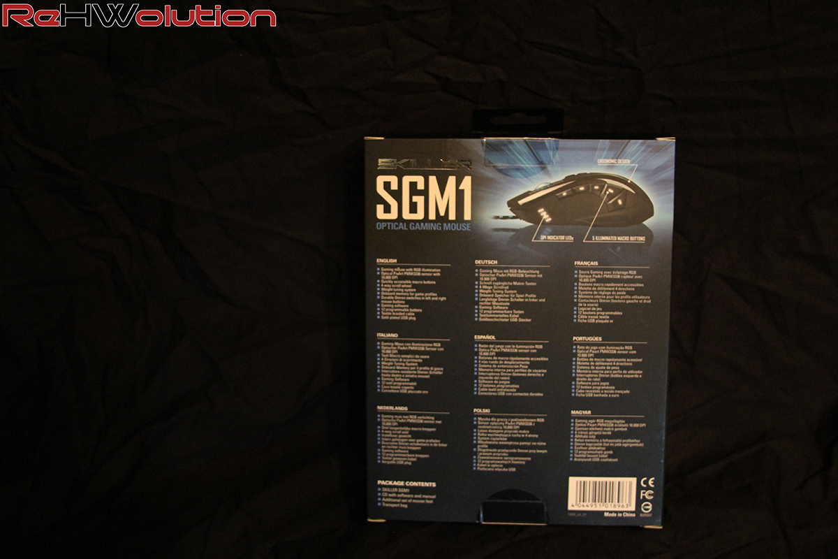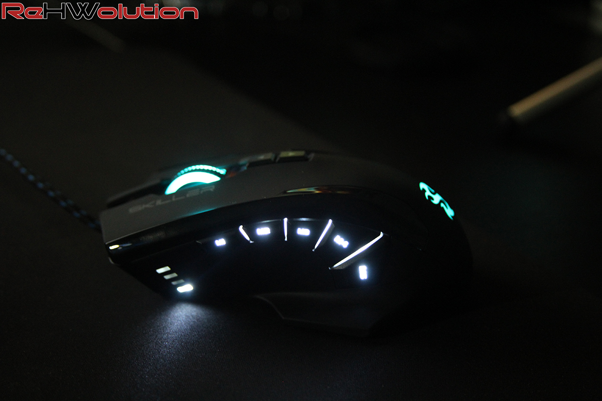 Analizzando le specifiche tecniche, lo Skiller SGM1 RGB è un mouse per destrorsi, equipaggiato con un sensore PixArt PMW-3336,  un sensore ottico di ultima generazione, tra i migliori in circolazione con un supporto massimo di 10.800DPI. Troviamo ben 5 tasti laterali (MACRO) programmabili a nostro piacimento grazie al software che ci viene fornito sia sul sito ufficiale che all’interno del cd che troviamo nel bundle. Abbiamo ben 3 zone illuminate, i tasti laterali vengono illuminati singolarmente con dei led bianchi, mentre il logo Skiller sul dorso e la rotellina hanno una funzione RGB programmabile (ritmo, movimento, velocità e colore) grazie al software di Sharkoon.