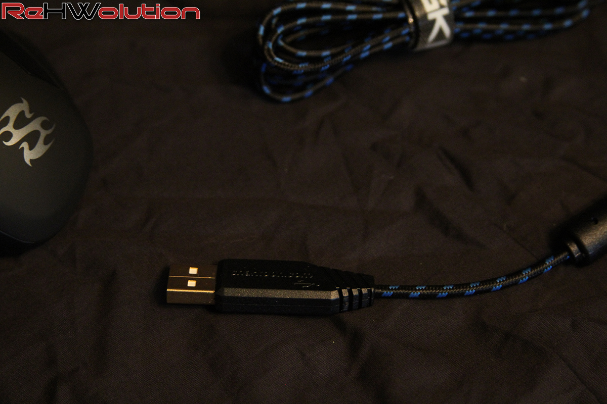 Il cavo è di circa 180cm, con una texture di fibra intrecciata in colozione blu/nero (sleeved) ed un connettore USB placcato oro all’estremità.