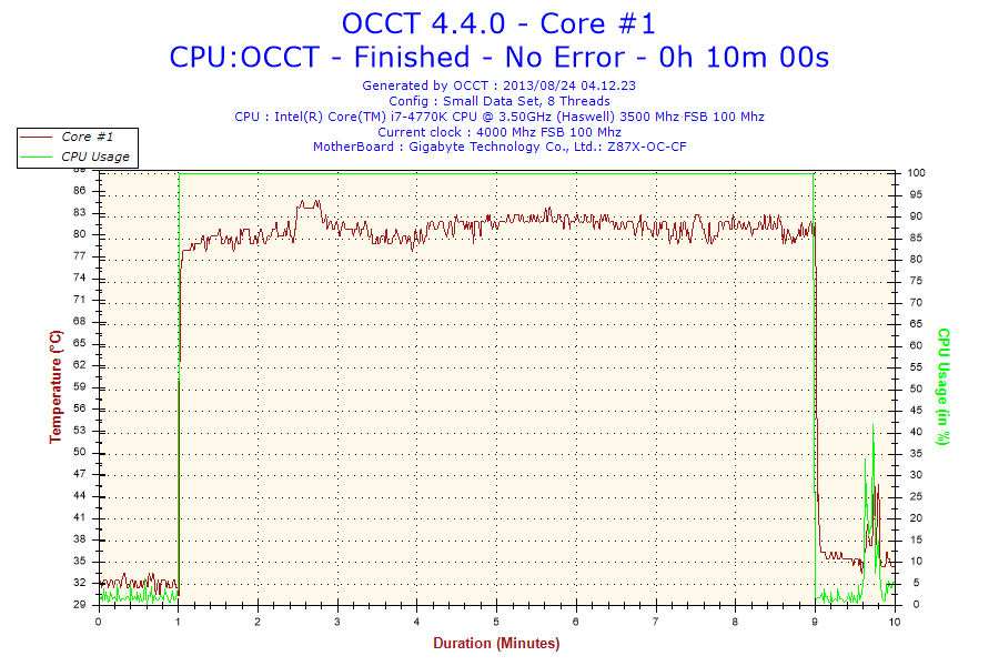 Il processore verrà stressato utilizzando la modalità Small Data Set di OCCT 4.4.0 in modalità CPU:OCCT, con 1 minuto in idle, 8 minuti sotto stress, ed infine un ulteriore minuto in idle, per un totale di 10 minuti. Leggerete le temperature rilevate grazie ai grafici generati dallo stesso software.
