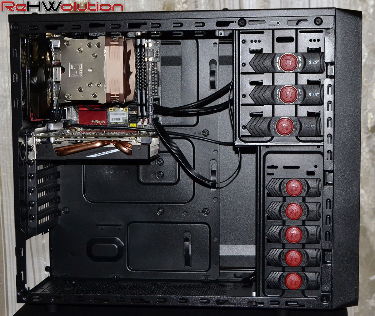 Nella parte anteriore, infine, è possibile installare 3 dispositivi da 5.25″ (Optical drives, rheobus, pannelli di controllo) ed un singolo dispositivo da 3.5″ (per capirci, delle dimensioni di un Floppy Drive). Soluzione particolare, ma orientata alla massima compatibilità. Sul fronte dello storage, infine, 5 slot da 3.5″ ed 1 da 2.5″ occupano la parte frontale interna del case.
