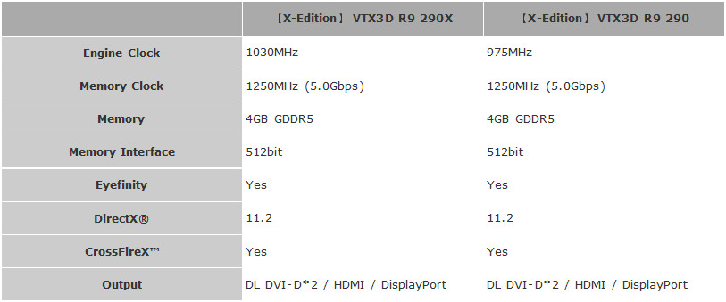 Le nuove VTX3D R9 290X/R9 290 X-Edition, entrambe dotate di 4 GB di memoria GDDR5, sono ad alte prestazioni e collegate tramite interfaccia di memoria a 512 bit.