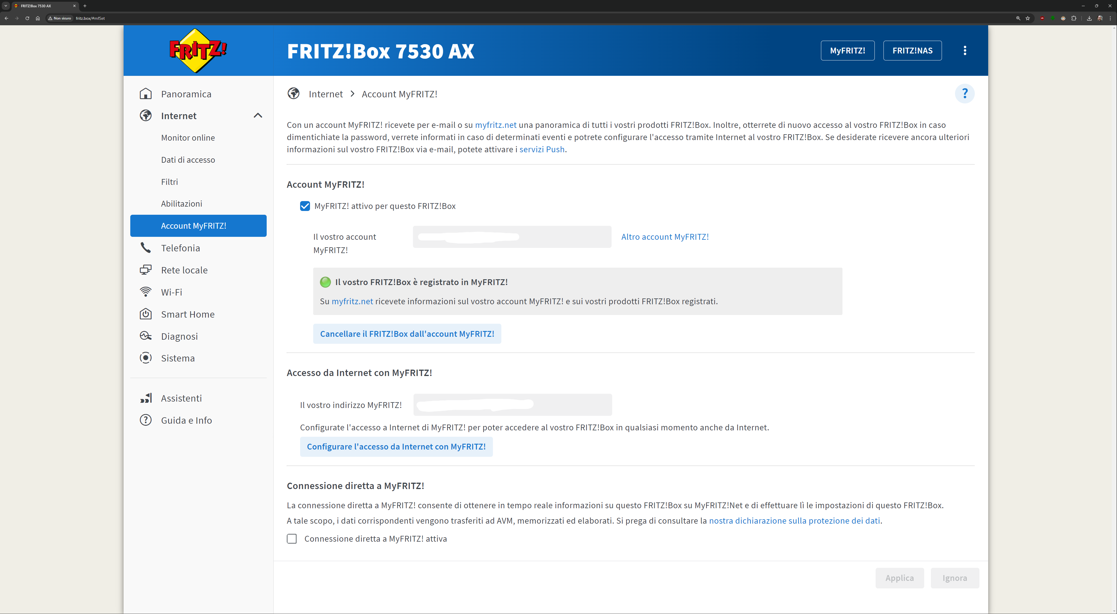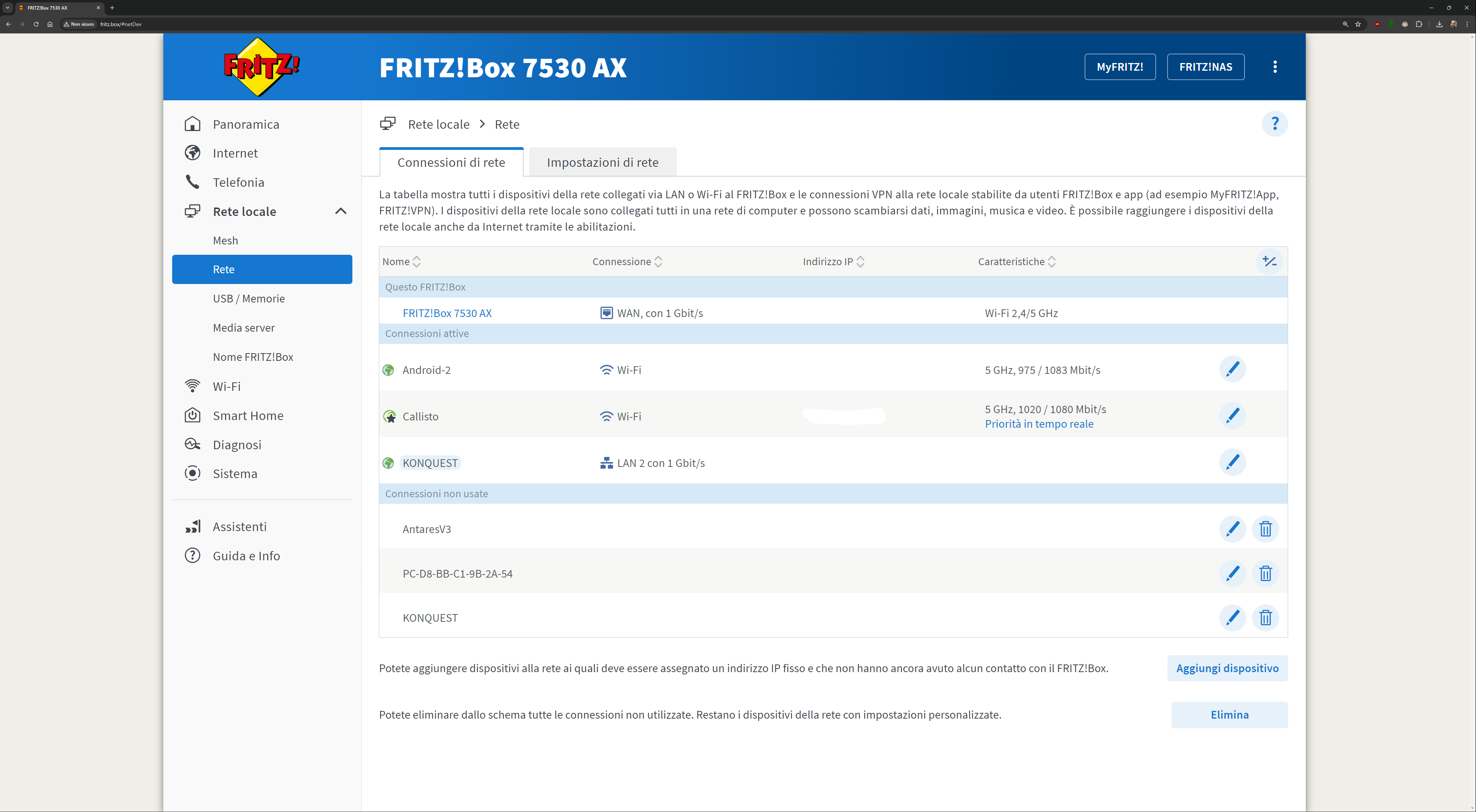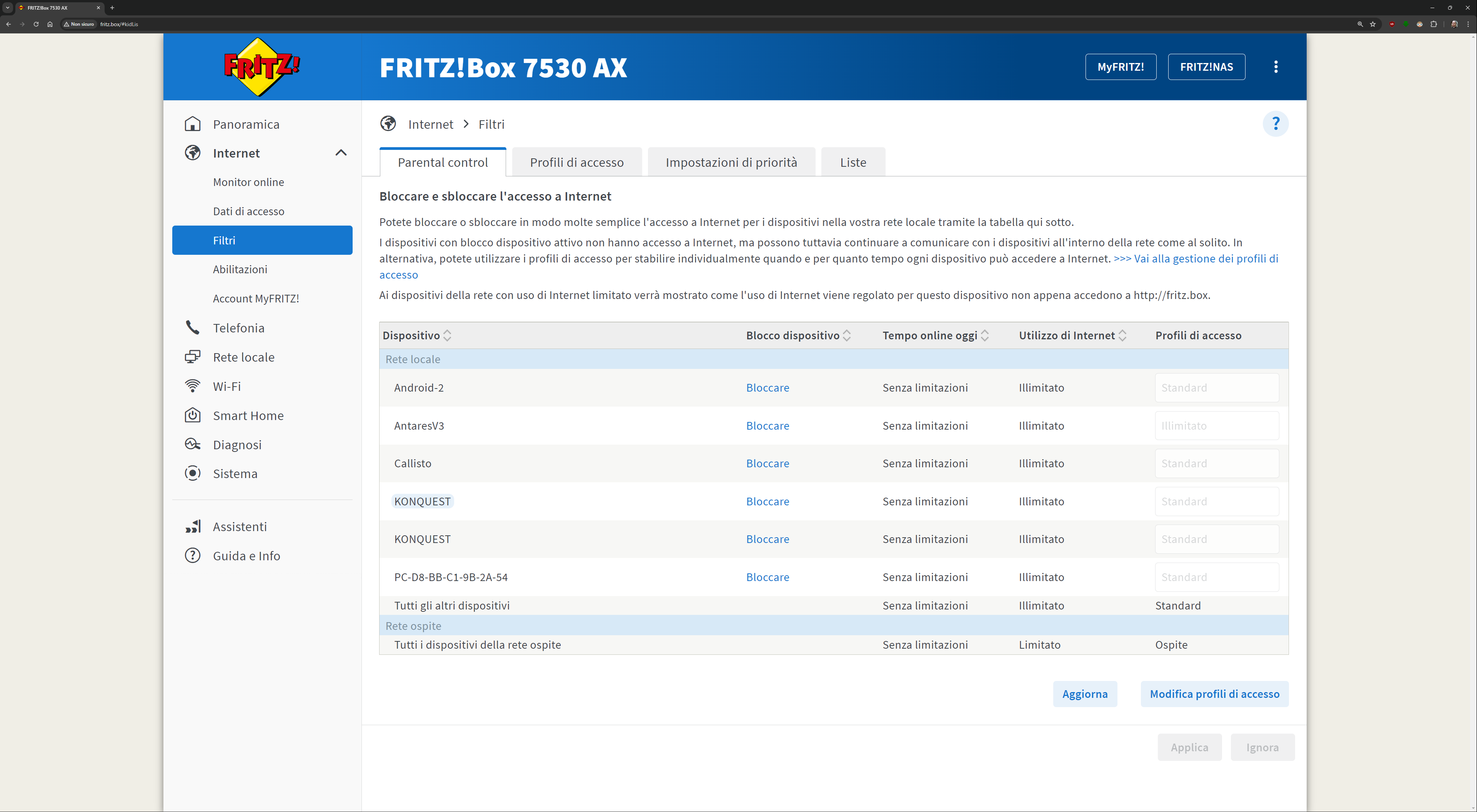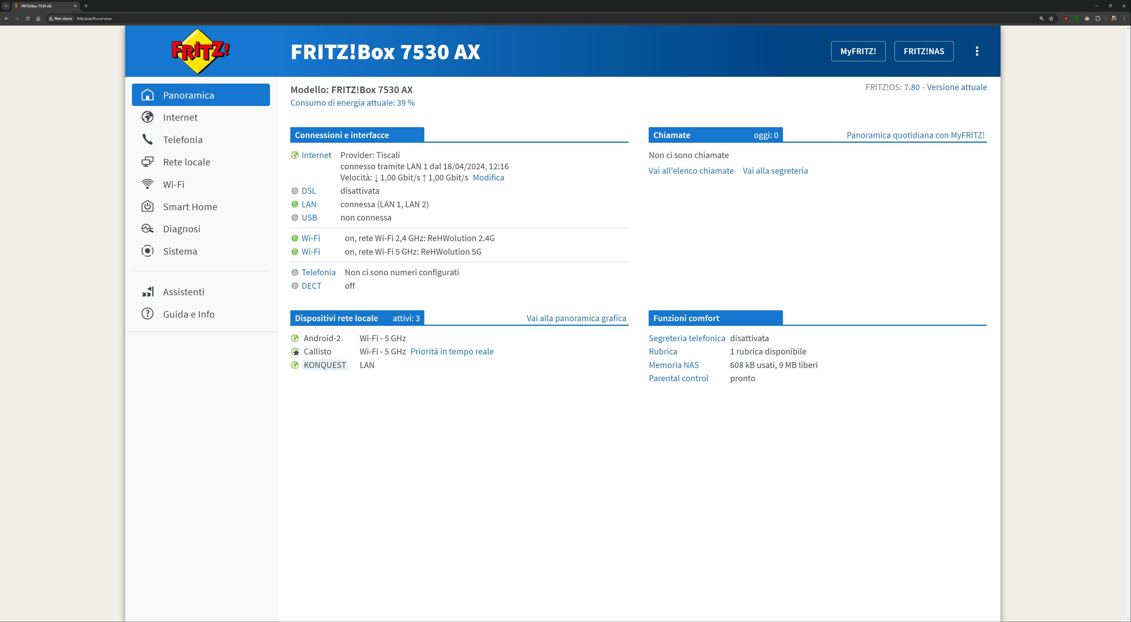 L’interfaccia presente all’indirizzo fritz.box una volta collegati al FRITZ!Box è davvero esaustiva. Ecco quindi una sfilza di screenshot dell’interfaccia. Molti indirizzi IP/MAC sono stati oscurati per ovvie ragioni di sicurezza: