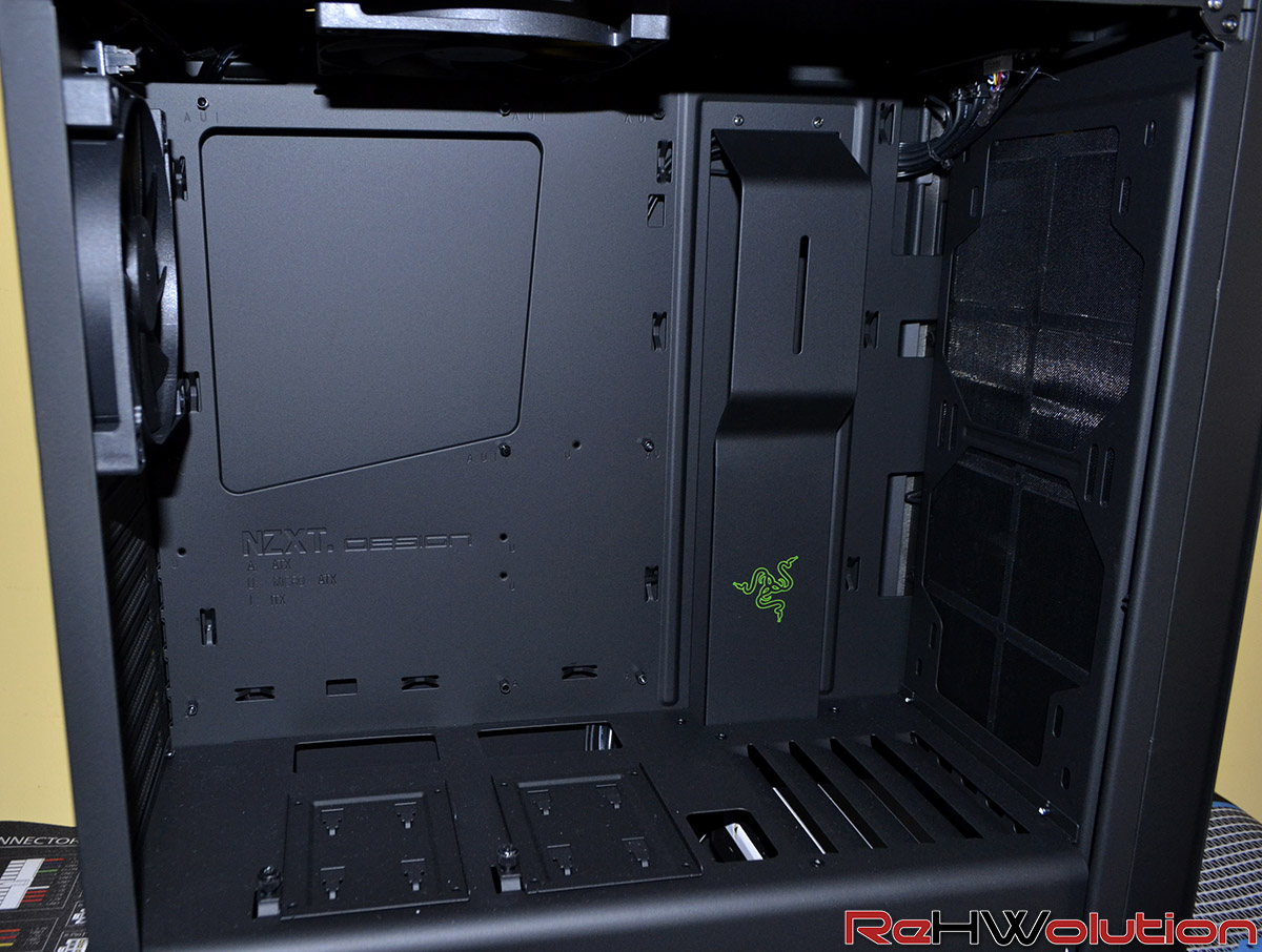 Cattivissima la cover nera con logo Razer che funge da copricavi nei pressi della mainboard, mai visto qualcosa del genere ed ora che l’ho vista su di un case, mi piacerebbe vederla su più soluzioni, magari anche concorrenti, con un’integrazione diversa. Poche, infine, le predisposizioni per ventole, soprattutto sul tetto dove è presente una sola predisposizione da 120-140 mm: avremmo preferito una predisposizione per radiatori da 240-280, in modo da accomodare anche sistemi AIO come l’NZXT Kraken X61, che però risulta installabile sul lato anteriore del cabinet.