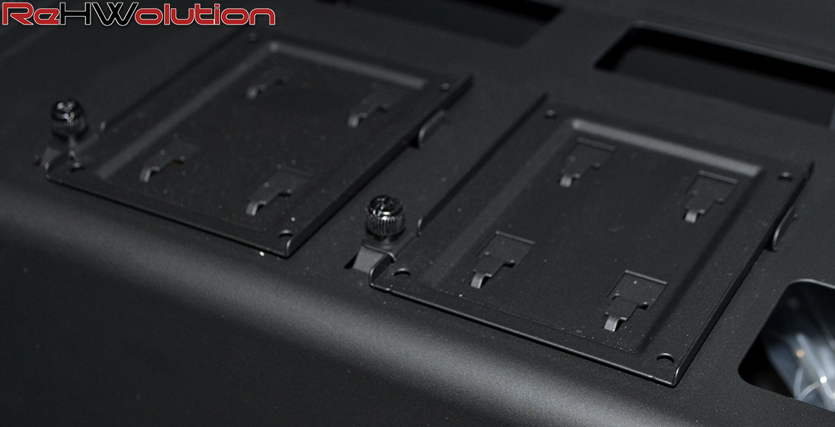 All’interno, troviamo tante soluzioni interessanti per l’installazione dell’hardware, come ad esempio le due predisposizioni sul copri-PSU che consentono di montare fino a 2 SSD o HDD da 2.5″, mentre sotto di esso troviamo un piccolo cage per HDD da 3.5″. All’occorrenza, è possibile installare un HDD da 2.5 o 3.5″ anche sul fondo del case, utilizzando la viteria in dotazione.