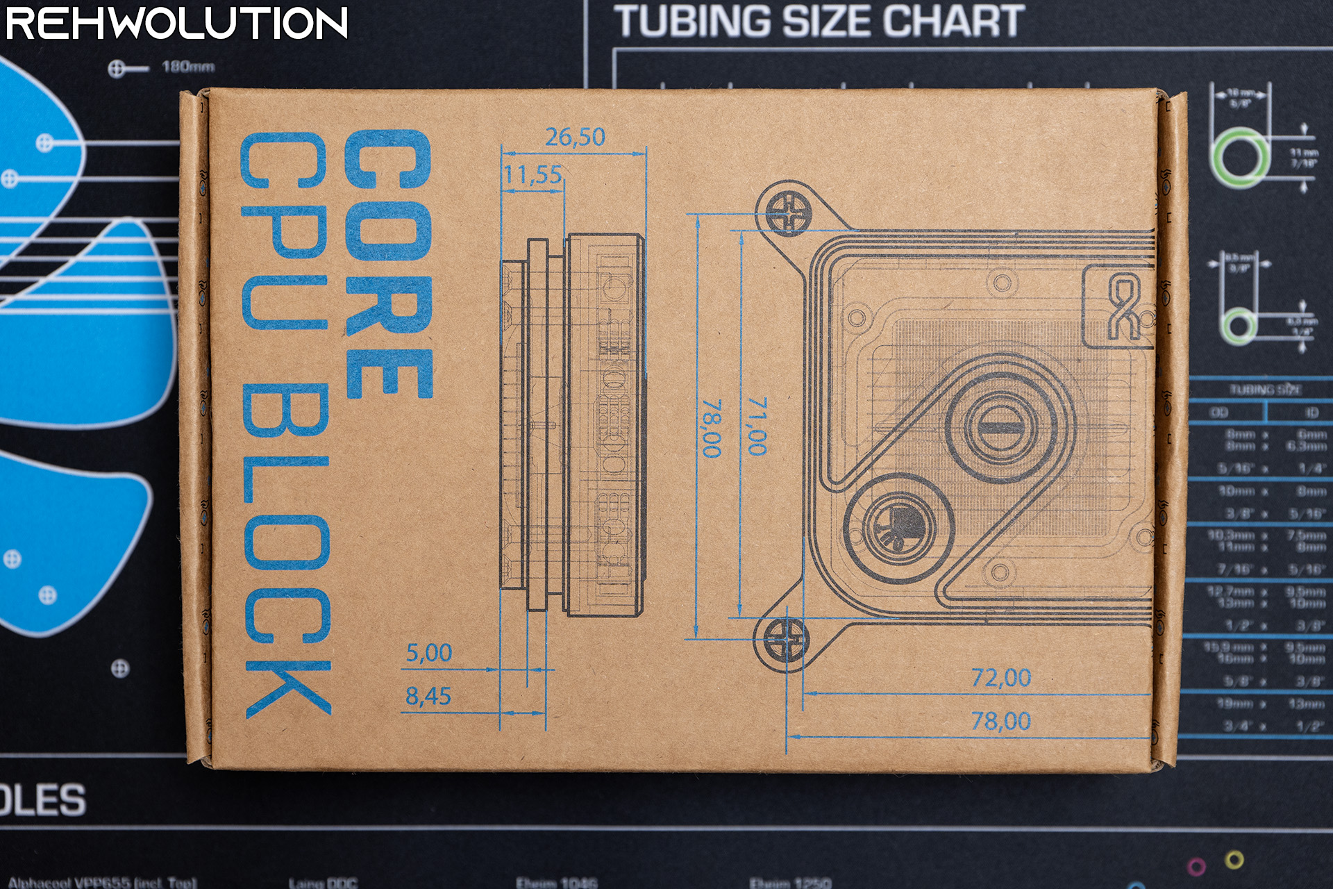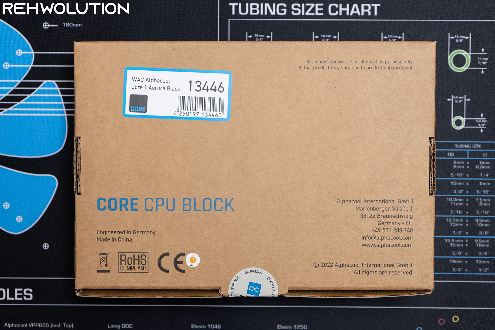 La confezione del waterblock di Alphacool è in cartone semplice, con le dimensioni principali del waterblock stampate su una vista in tavola a raggi X del CORE 1 Aurora, mentre sul retro troviamo alcune informazioni su Alphacool ed il codice a barre con la SKU del prodotto.
