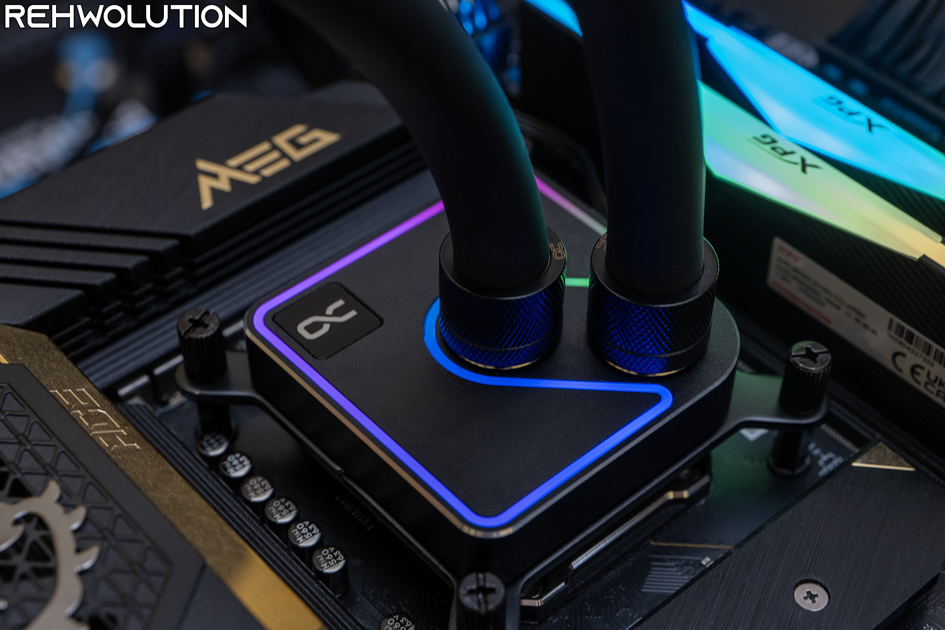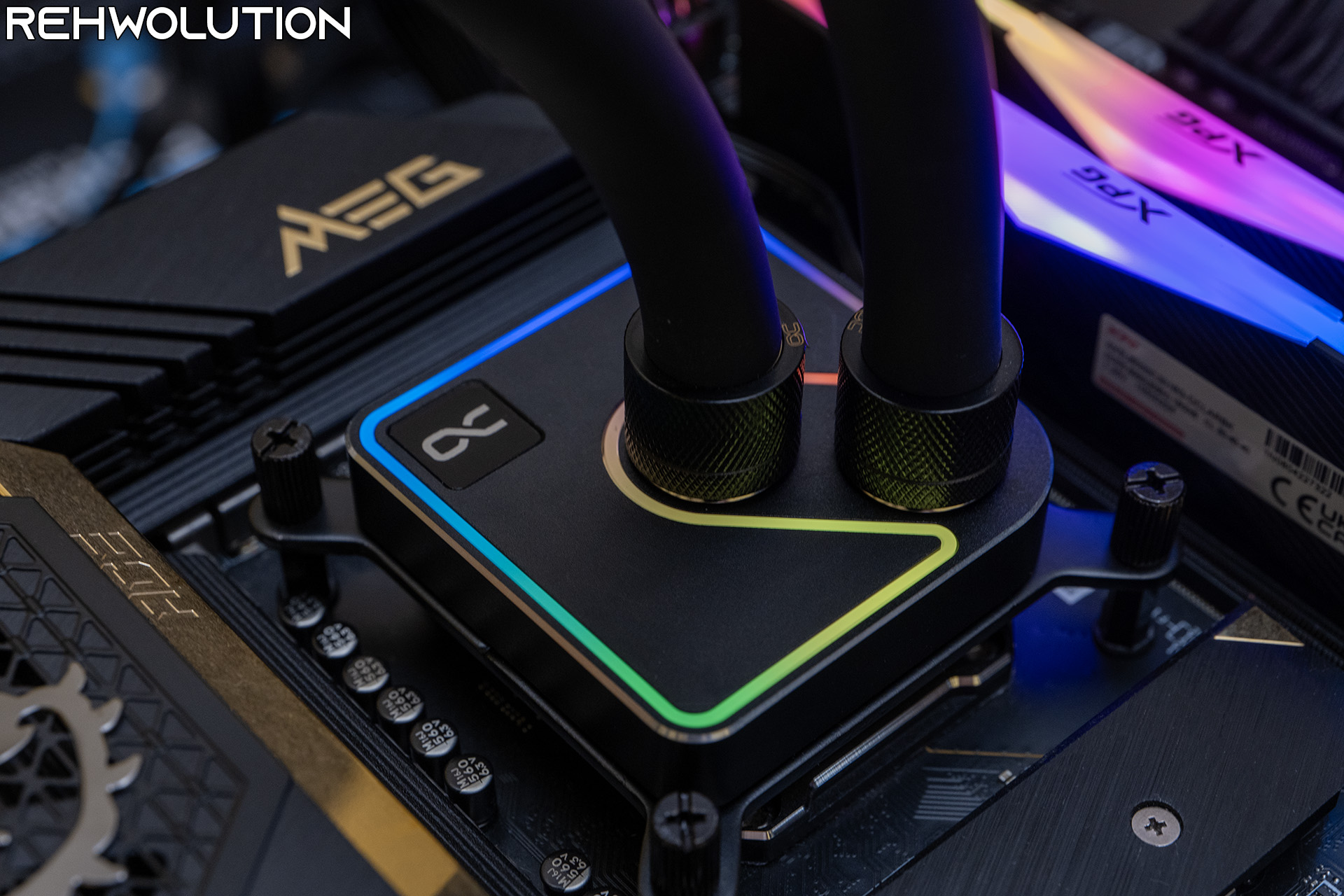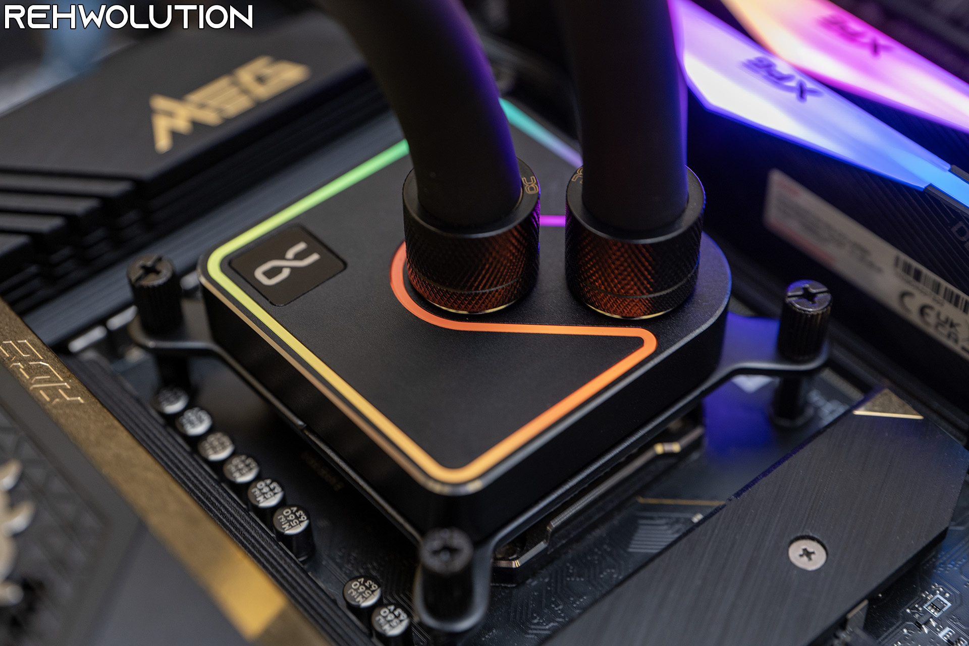 Ecco come si presenta il waterblock una volta montato, con alcuni dei colori dell’illuminazione RGB mostrati in fotografia. Niente di sgargiante, con un effetto di illuminazione dall’ottima diffusione e senza che i singoli LED della striscia montata all’interno del waterblock siano visibili.