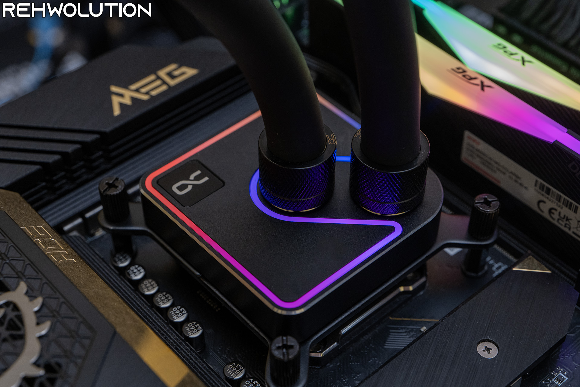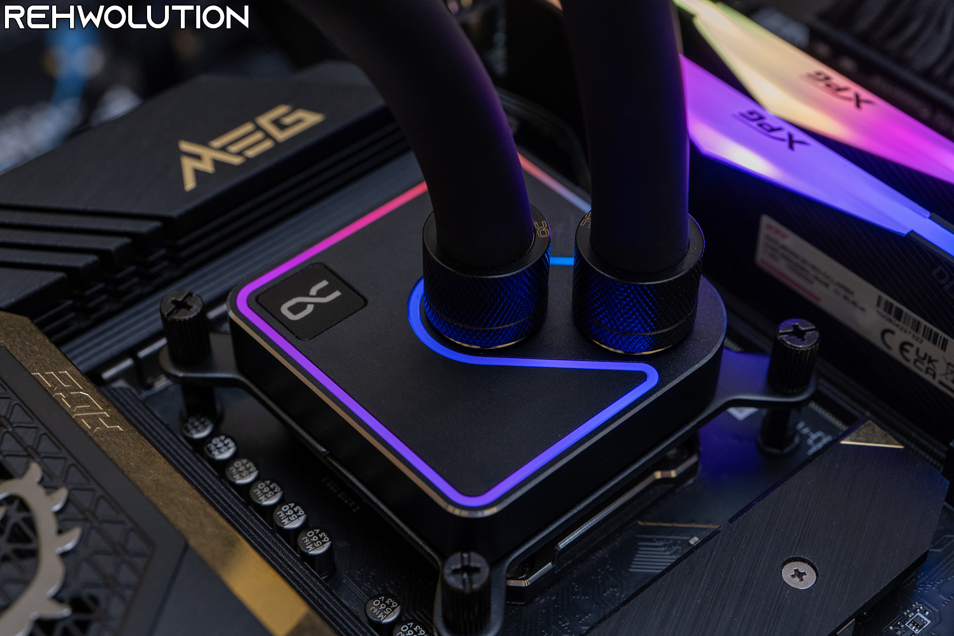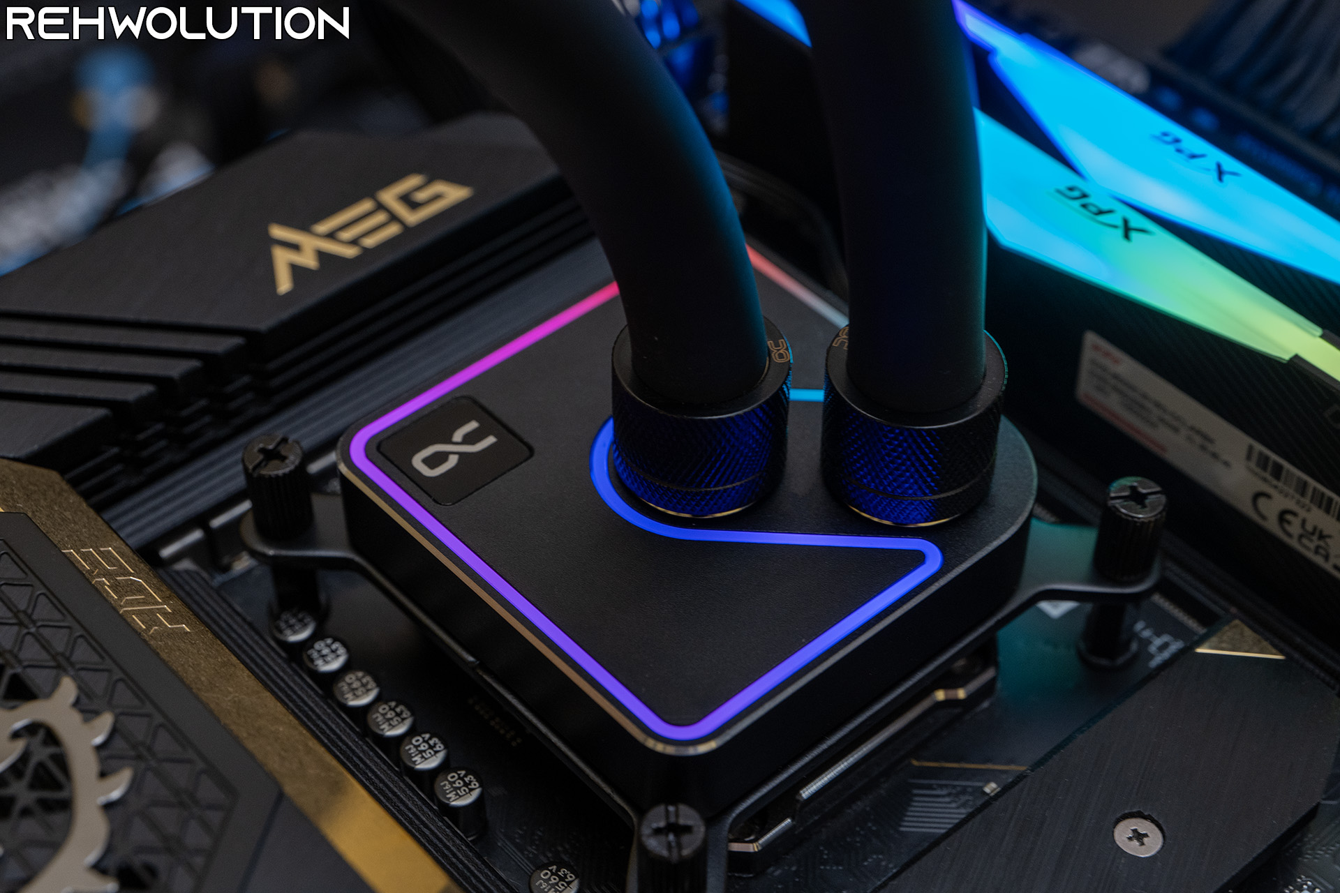 Ecco come si presenta il waterblock una volta montato, con alcuni dei colori dell’illuminazione RGB mostrati in fotografia. Niente di sgargiante, con un effetto di illuminazione dall’ottima diffusione e senza che i singoli LED della striscia montata all’interno del waterblock siano visibili.