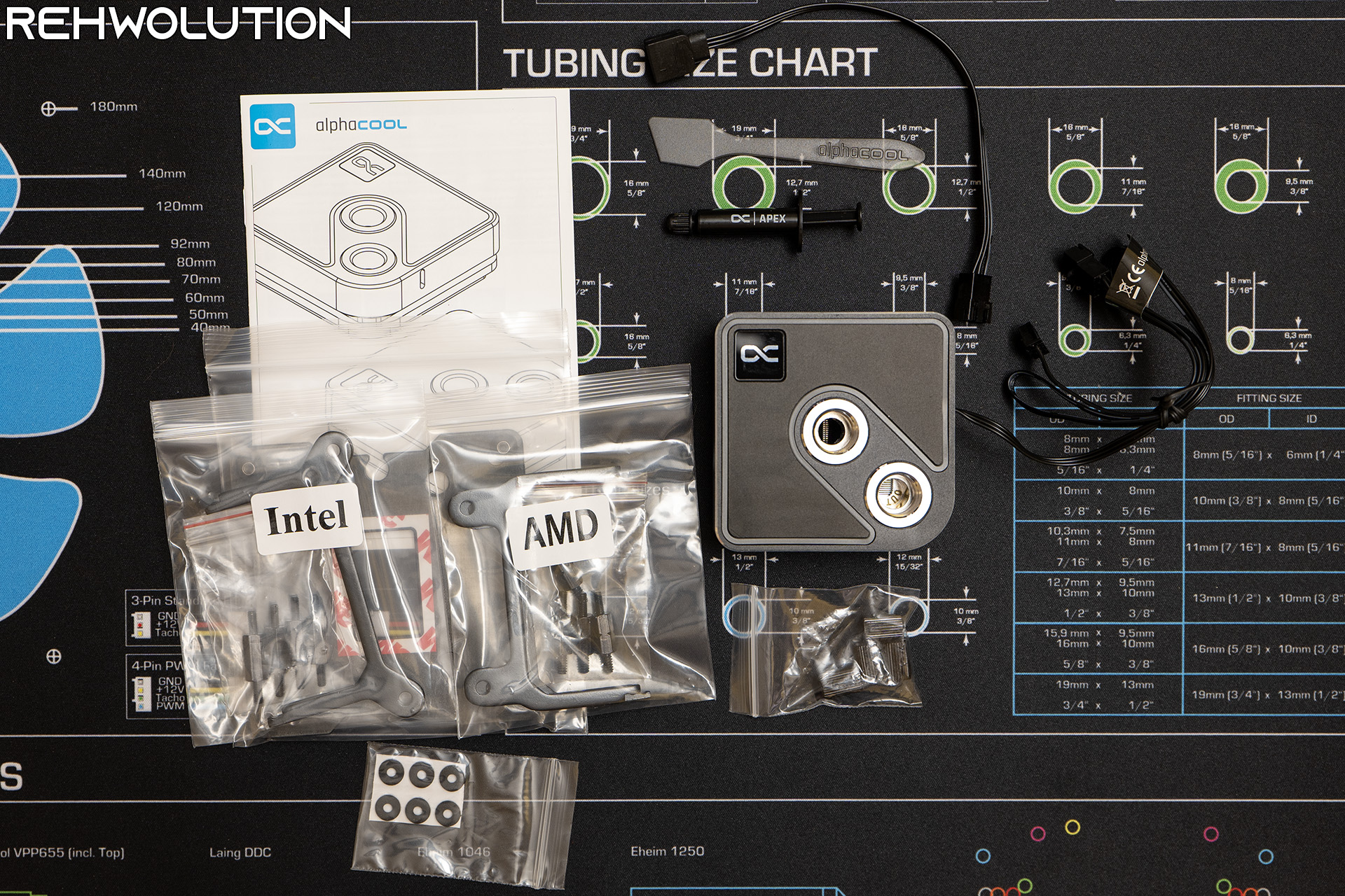 Insieme ai bracket per Intel ed AMD troviamo inoltre un tubetto da 1 grammo di pasta termica Alphacool APEX, una spatola per l’applicazione di suddetta pasta ed un cavo adattatore dal formato JST utilizzato dall’azienda per la gestione dell’illuminazione RGB al più diffuso e versatile connettore ARGB 5 V a 3 pin.