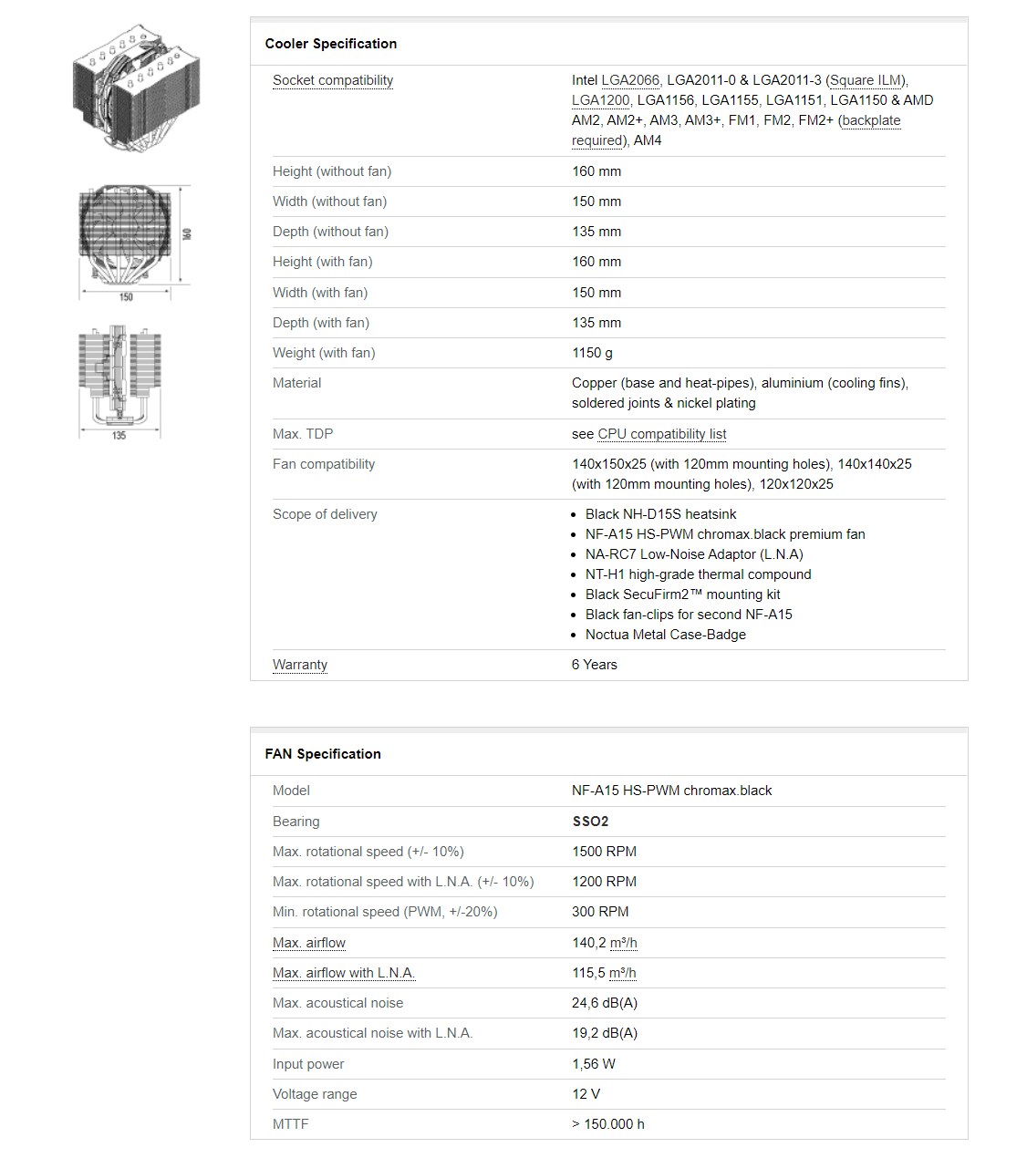 Di seguito, le specifiche del dissipatore Noctua NH-D15S chromax.black. Per ulteriori dettagli e per la pagina dei download da cui scaricare i driver, vi rimandiamo al sito del produttore (Noctua):