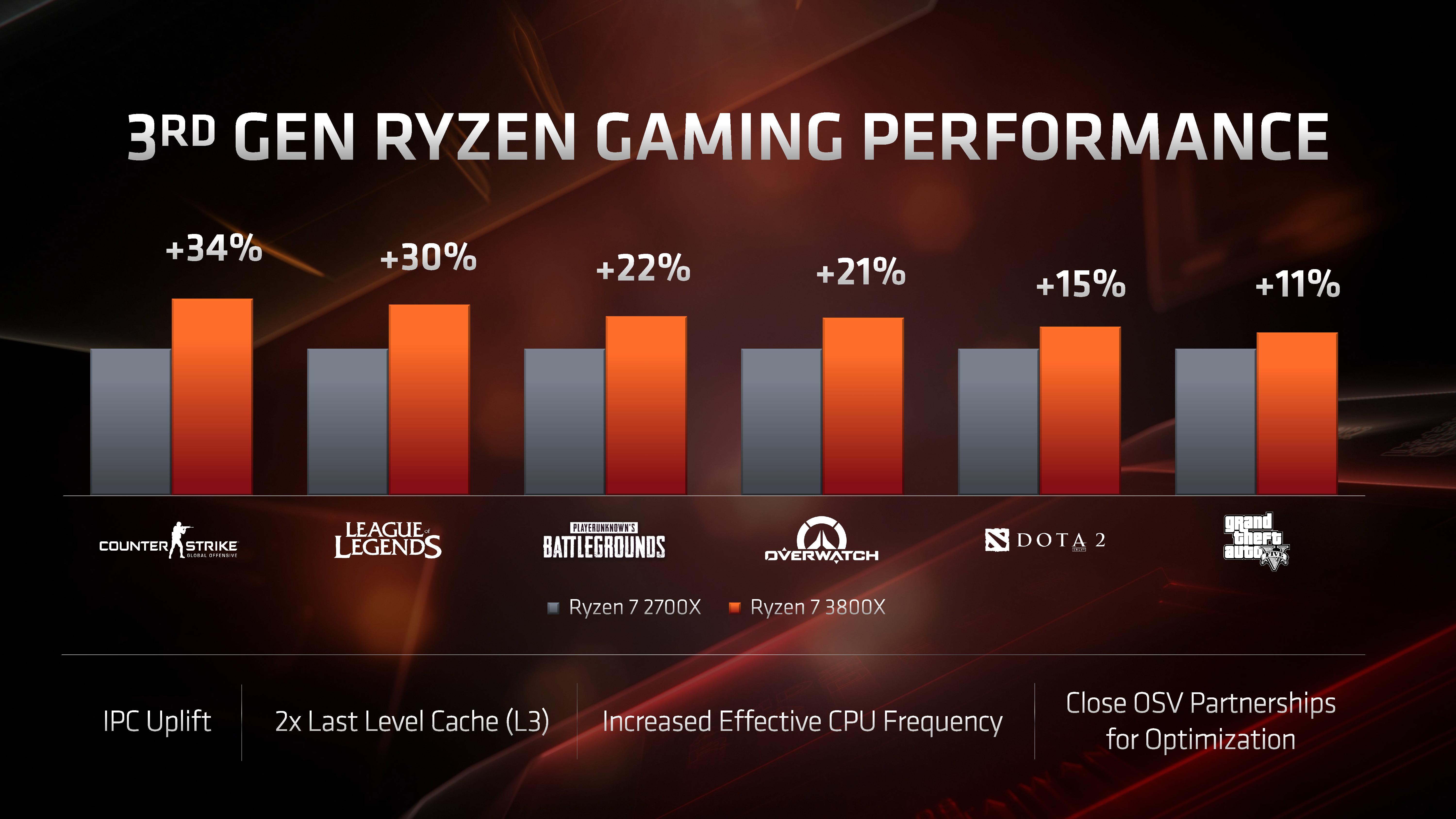 In ambito gaming, AMD è abbastanza coraggiosa nell’affermare che, rispetto al 2700X, il nuovo 3800X ha performance che vanno dall’11% al 34% in più in termini di FPS.